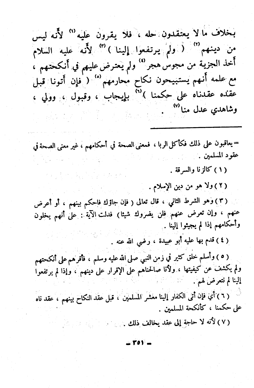 (¬3) وهو الشرط الثاني، قال تعالى {فَإِنْ جَاءُوكَ فَاحْكُمْ بَيْنَهُمْ أَوْ أَعْرِضْ عَنْهُمْ وَإِنْ تُعْرِضْ عَنْهُمْ فَلَنْ يَضُرُّوكَ شَيْئًا} فدلت الآية: على أنهم يخلون وأحكامهم إذا لم يجيئوا إلينا.