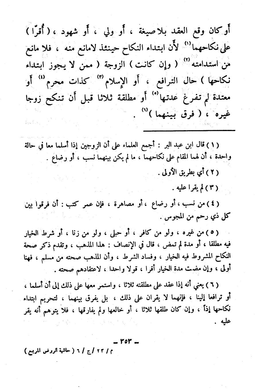 (¬6) يعني أنه إذا عقد على مطلقته ثلاثا، واستمر معها على ذلك إلى أن أسلما، أو ترافعا إلينا، فإنهما لا يقران على ذلك، بل يفرق بينهما، لتحريم ابتداء نكاحها إذًا، وإن كان طلقها ثلاثا، أو خالعها ولم يفارقها، فلا يتوهم أنه يقر عليه.