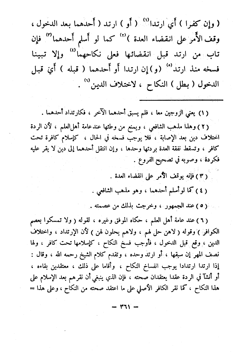 (¬6) عند عامة أهل العلم، حكاه الموفق وغيره، لقوله {وَلا تُمْسِكُوا بِعِصَمِ الْكَوَافِرِ} وقوله {لا هُنَّ حِلٌّ لَهُمْ وَلا هُمْ يَحِلُّونَ لَهُنَّ} لأن الإرتداد، واختلاف الدين، وقع قبل الدخول، فأوجب فسخ النكاح، كإسلامها تحت كافر، ولها نصف المهر إن سبقها، أو ارتد وحده، وتقدم كلام الشيخ رحمه الله، وقال: إذا ارتدا ارتدادا يوجب انفساخ النكاح، وأقاما على ذلك، معتقدين بقاؤه، أو أنشآ في الردة عقدًا يعتقدان صحته، فإن الذي ينبغي أن نقرهم بعد الإسلام على هذا النكاح، كما نقر الكافر الأصلي على ما اعتقد صحته من النكاح، وعلى هذا يحمل تقرير الصحابة للمرتدين على مناكحهم بعد الإسلام، فإنه مثل تقرير الكفار الأصليين.