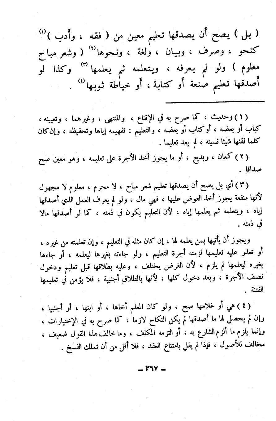 (¬1) وحديث، كما صرح به في الإقناع، والمنتهى، وغيرهما، وتعيينه، كباب أو بعضه، أو كتاب أو بعضه، والتعليم: تفهيمه إياها وتحفيظه، وإن كان كلما لقنها شيئًا نسيته، لم يعد تعليما.