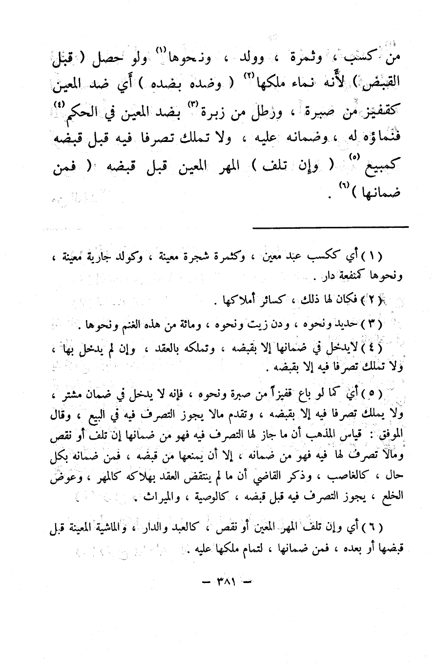 (¬5) أي كما لو باع قفيزًا من صبرة ونحوه، فإنه لا يدخل في ضمان مشتر، ولا يملك تصرفا فيه إلا بقبضه، وتقدم ما لا يجوز التصرف فيه في البيع، وقال الموفق: قياس المذهب أن ما جاز لها التصرف فيه فهو من ضمانها إن تلف أو نقص وما لا تصرف لها فيه فهو من ضمانه، إلا أن يمنعها من قبضه، فمن ضمانه بكل حال، كالغاصب، وذكر القاضي أن ما لم ينتقض العقد بهلاكه كالمهر، وعوض الخلع، يجوز التصرف فيه قبل قبضه، كالوصية، والميراث.