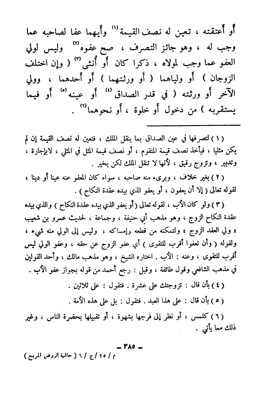 (¬3) ولو كان الأب، لقوله تعالى {أَوْ يَعْفُوَ الَّذِي بِيَدِهِ عُقْدَةُ النِّكَاحِ} والذي بيده عقدة النكاح الزوج، وهو مذهب أبي حنيفة، وجماعة، لحديث عمرو بن شعيب «ولي العقد الزوج» ولتمكنه من قطعه وإمساكه، وليس إلى الولي منه شيء، ولقوله {وَأَنْ تَعْفُوا أَقْرَبُ لِلتَّقْوَى} أي عفو الزوج عن حقه، وعفو الولي ليس أقرب للتقوى، وعنه: الأب. اختاره الشيخ، وهو مذهب مالك، وأحد القولين في مذهب الشافعي وقول طائفة، وقيل: رجع أحمد من قوله بجواز عفو الأب.