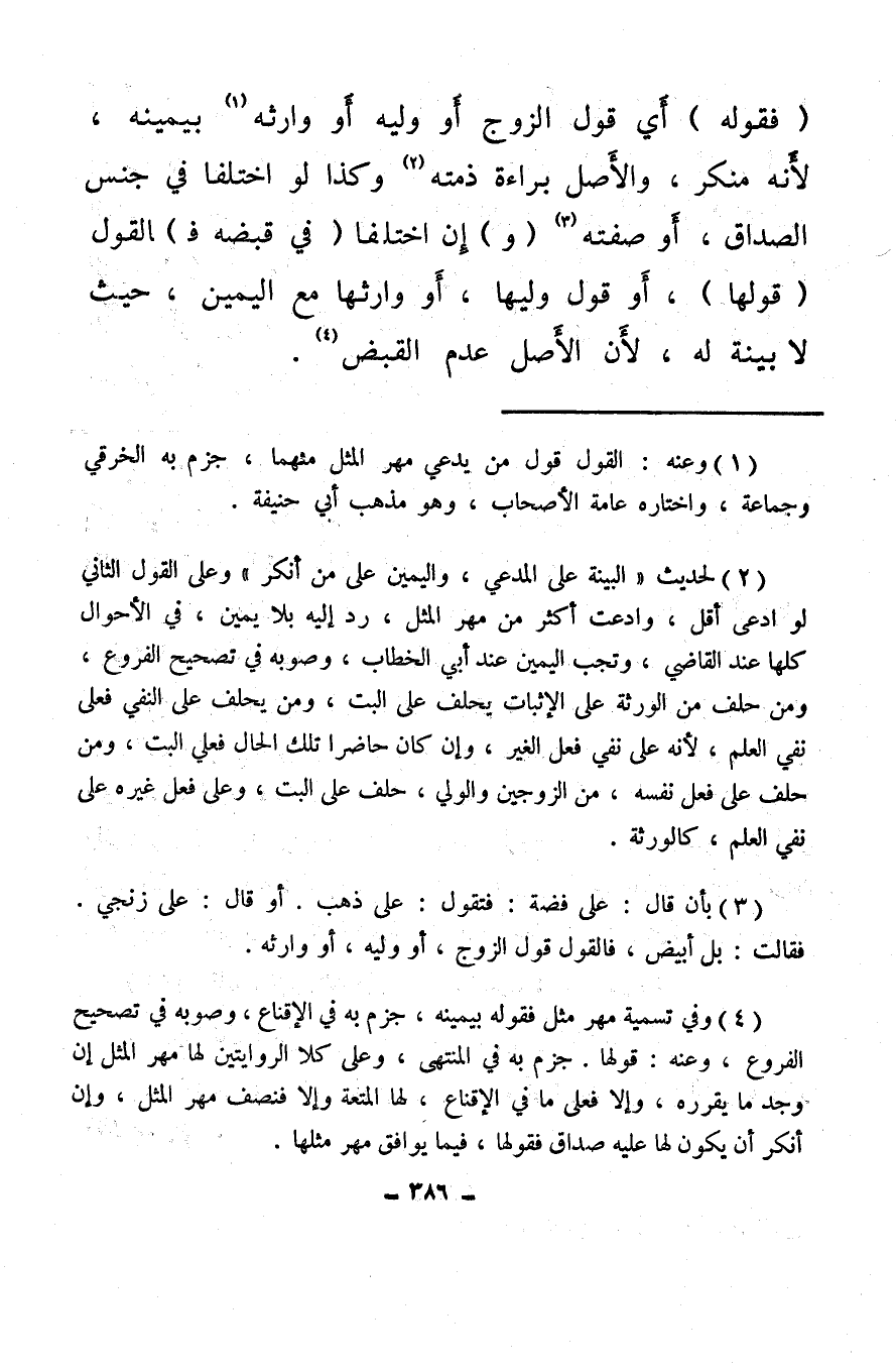 (¬2) لحديث «البينة على المدعي، واليمين على من أنكر» وعلى القول الثاني لو ادعى أقل، وادعت أكثر من مهر المثل، رد إليه بلا يمين، في الأحوال كلها عند القاضي، وتجب اليمين عند أبي الخطاب، وصوبه في تصحيح الفروع، ومن حلف من الورثة على الإثبات يحلف على البت، ومن يحلف على النفي فعلى نفي العلم، لأنه على نفي فعل الغير، وإن كان حاضرا تلك الحال فعلى البت، ومن حلف على فعل نفسه، من الزوجين والولي، حلف على البت، وعلى فعل غيره على نفي العلم، كالورثة.