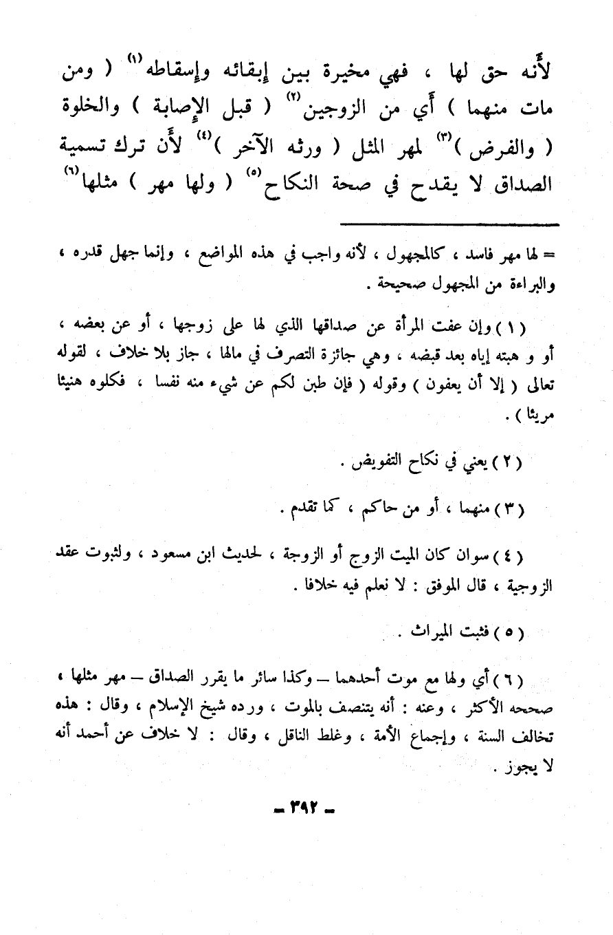 (¬6) أي ولها مع موت أحدهما – وكذا سائر ما يقرر الصداق – مهر مثلها، صححه الأكثر، وعنه: أنه يتنصف بالموت، ورده شيخ الإسلام، وقال: هذه تخالف السنة، وإجماع الأمة، وغلط الناقل، وقال: لا خلاف عن أحمد أنه لا يجوز.