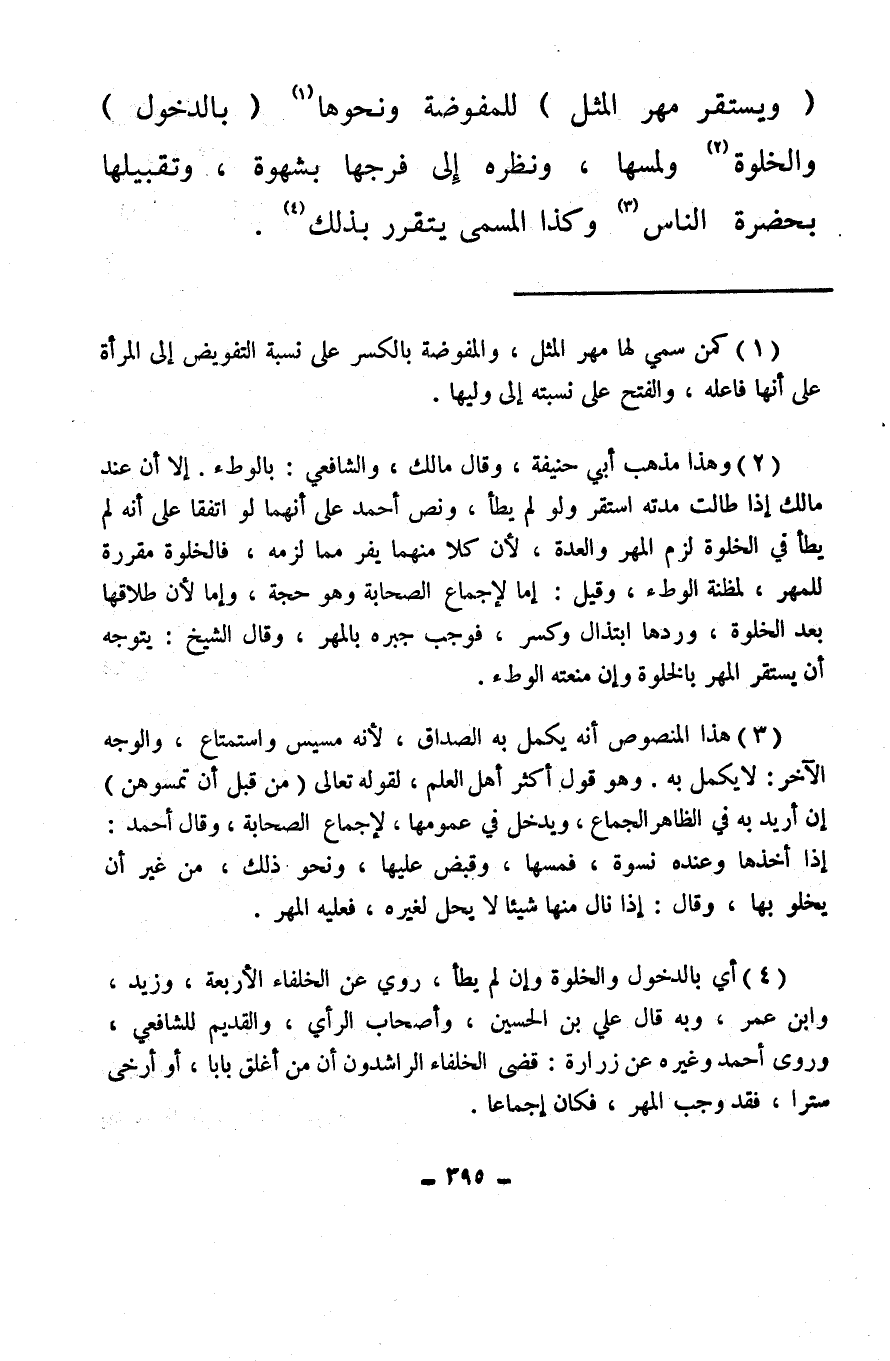 (¬4) أي بالدخول والخلوة وإن لم يطأ، روي عن الخلفاء الأربعة، وزيد، وابن عمر، وبه قال علي ابن الحسين، وأصحاب الرأي، والقديم للشافعي، وروى أحمد وغيره عن زرارة: قضى الخلفاء الراشدون أن من أغلق بابا، أو أرخى سترا، فقد وجب المهر، فكان إجماعًا.
