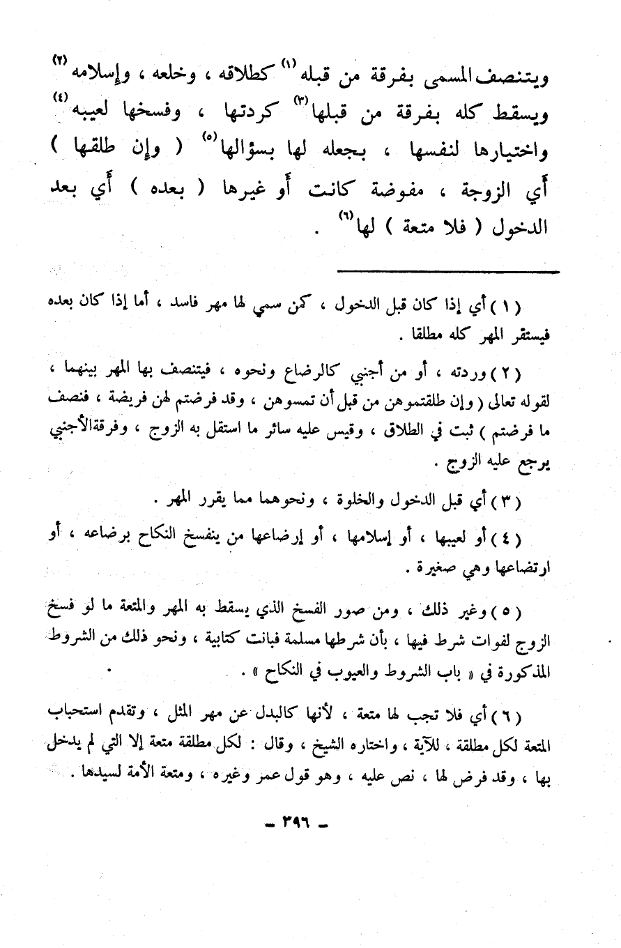 (¬5) وغير ذلك، ومن صور الفسخ الذي يسقط به المهر والمتعة ما لو فسخ الزوج لفوات شرط فيها، بأن شرطها مسلمة فبانت كتابية، ونحو ذلك من الشروط المذكورة في «باب الشروط والعيوب في النكاح» .