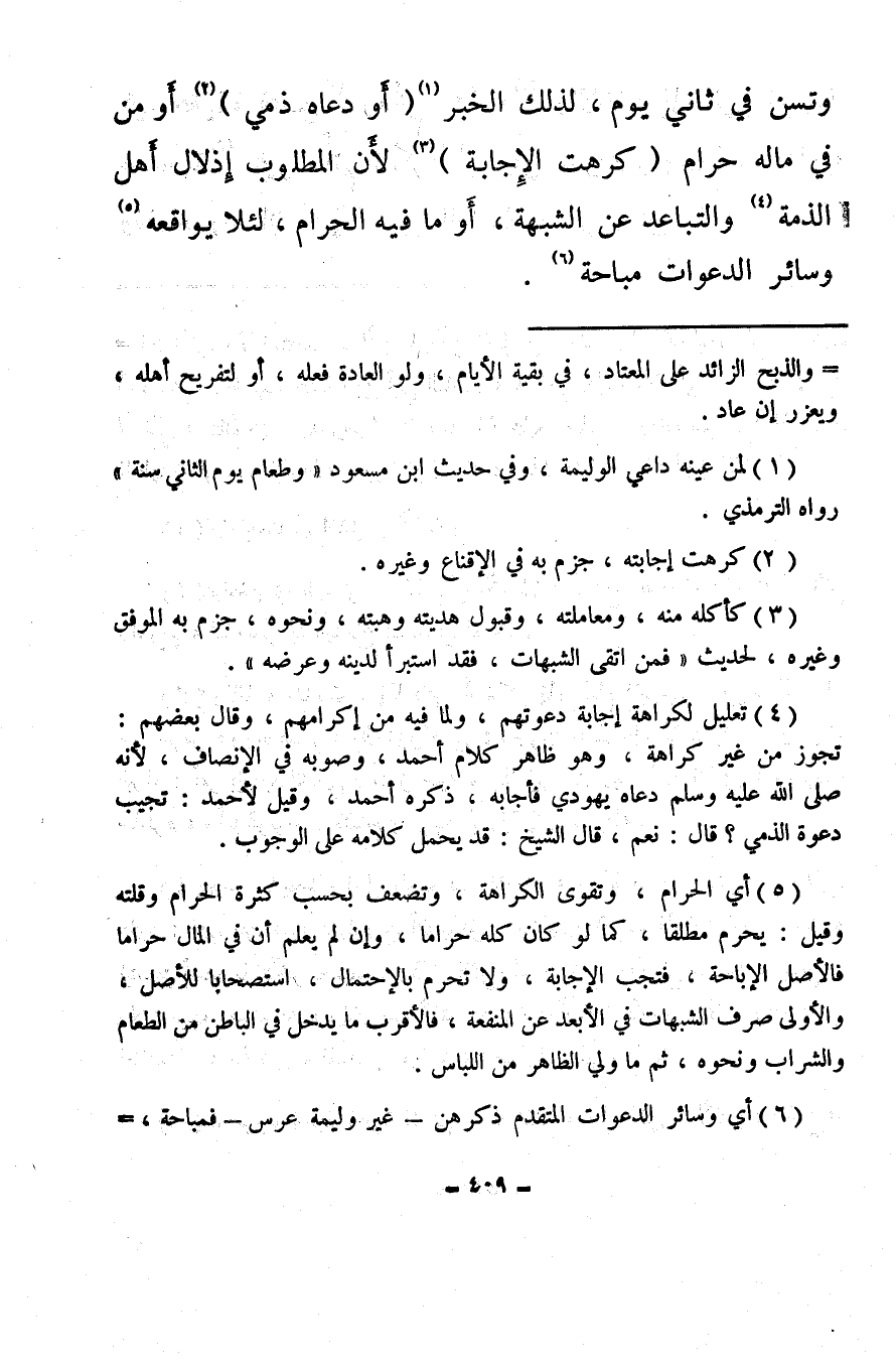 وتسن في ثاني يوم، لذلك الخبر (¬1) (أَو دعاه ذمي) (¬2) أَو من في ماله حرام (كرهت الإجابة) (¬3) لأن المطلوب إذلال أهل الذمة (¬4) والتباعد عن الشبهة، أو ما فيه الحرام، لئلا يواقعه (¬5) وسائر الدعوات مباحة (¬6) .