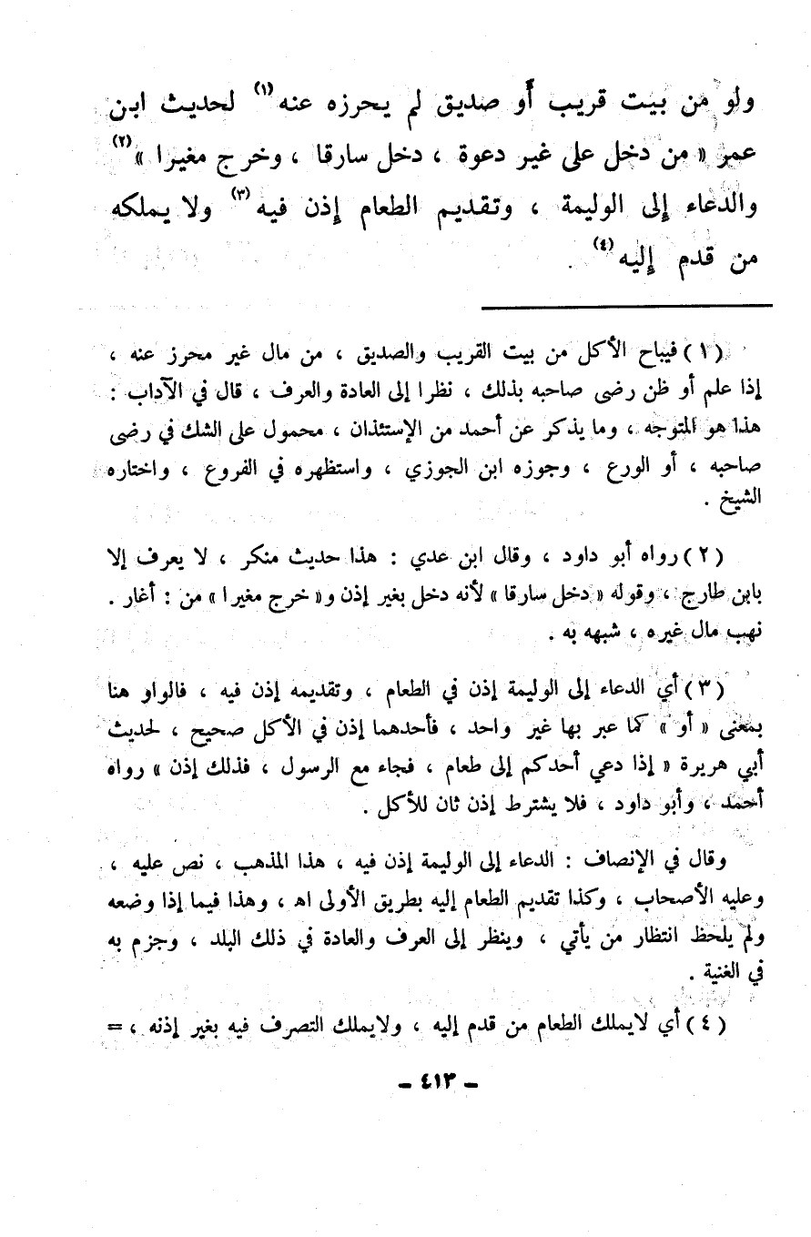 (¬1) فيباح الأكل من بيت القريب والصديق، من مال غير محرز عنه، إذا علم أو ظن رضى صاحبه بذلك، نظرا إلى العادة والعرف، قال في الآداب: هذا هو المتوجه، وما يذكر عن أحمد من الاستئذان، محمول على الشك في رضى صاحبه، أو الورع، وجوزه ابن الجوزي، واستظهره في الفروع، واختاره الشيخ.