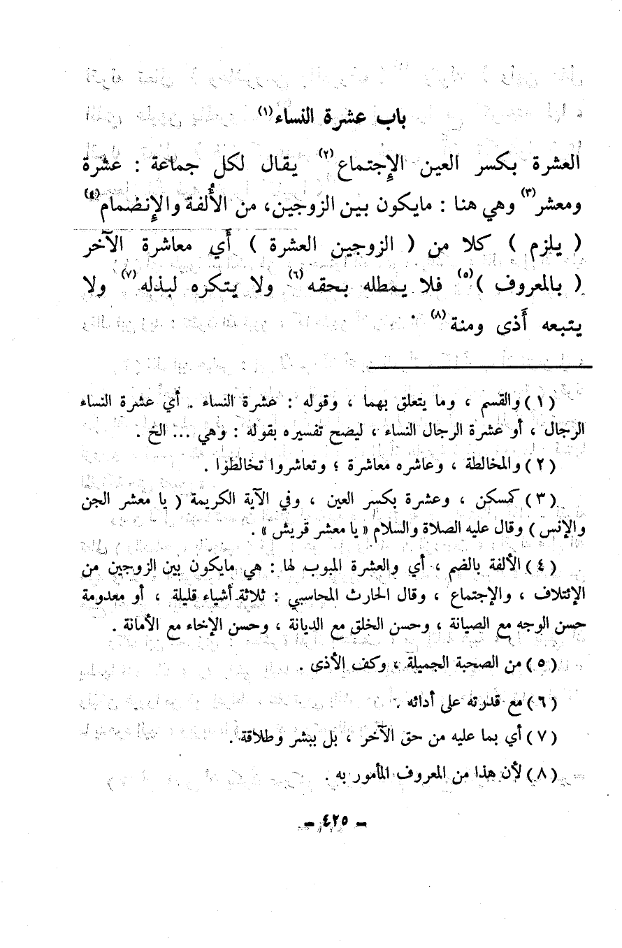 (¬1) والقسم، وما يتعلق بهما، وقوله: عشرة النساء. أي عشرة النساء الرجال، أو عشرة الرجال النساء، ليصح تفسيره بقوله: وهي ... الخ.