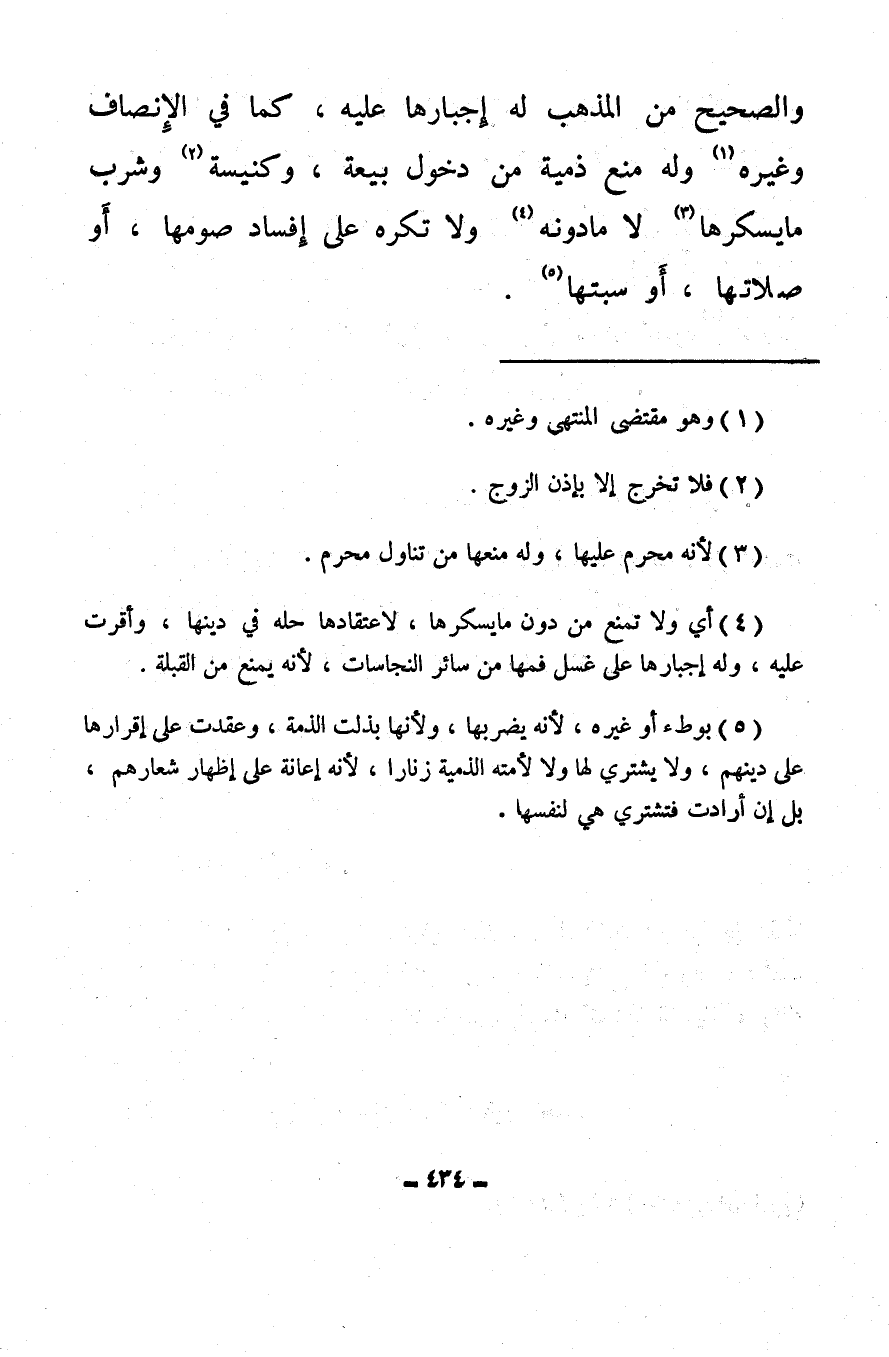 (¬5) بوطء أو غيره، لأنه يضر بها، ولأنها بذلت الذمة، وعقدت على إقرارها على دينهم، ولا يشتري لها ولا لأمته الذمية زنارا، لأنه إعانة على إظهار شعارهم، بل إن أرادت فتشتري هي لنفسها.