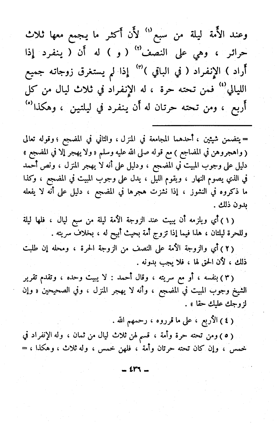 (¬5) ومن تحته حرة وأمة، قسم لهن ثلاث ليال من ثمان، وله الإنفراد في خمس، وإن كانت تحته حرتان وأمة، فلهن خمس، وله ثلاث، وهكذا،