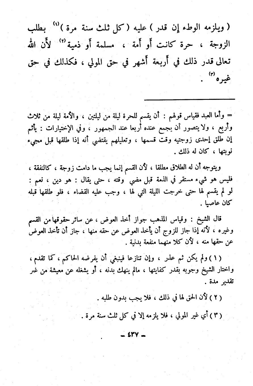 (ويلزمه الوطء إن قدر) عليه (كل ثلث سنة مرة) (¬1) بطلب الزوجة، حرة كانت أَو أَمة، مسلمة أو ذمية (¬2) لأن الله تعالى قدر ذلك في أربعة أَشهر في حق المولي، فكذلك في حق غيره (¬3) .