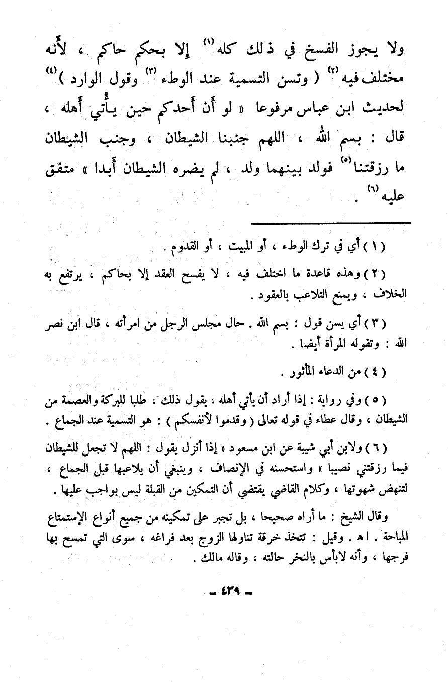 ولا يجوز الفسخ في ذلك كله (¬1) إلا بحكم حاكم، لأَنه مختلف فيه (¬2) (وتسن التسمية عند الوطء (¬3) وقول الوارد) (¬4) لحديث ابن عباس مرفوعا «لو أَن أحدكم حين يأْتي أهله، قال: بسم الله، اللهم جنبنا الشيطان، وجنب الشيطان ما رزقتنا (¬5) فولد بينهما ولد، لم يضره الشيطان أَبدا» متفق عليه (¬6) .