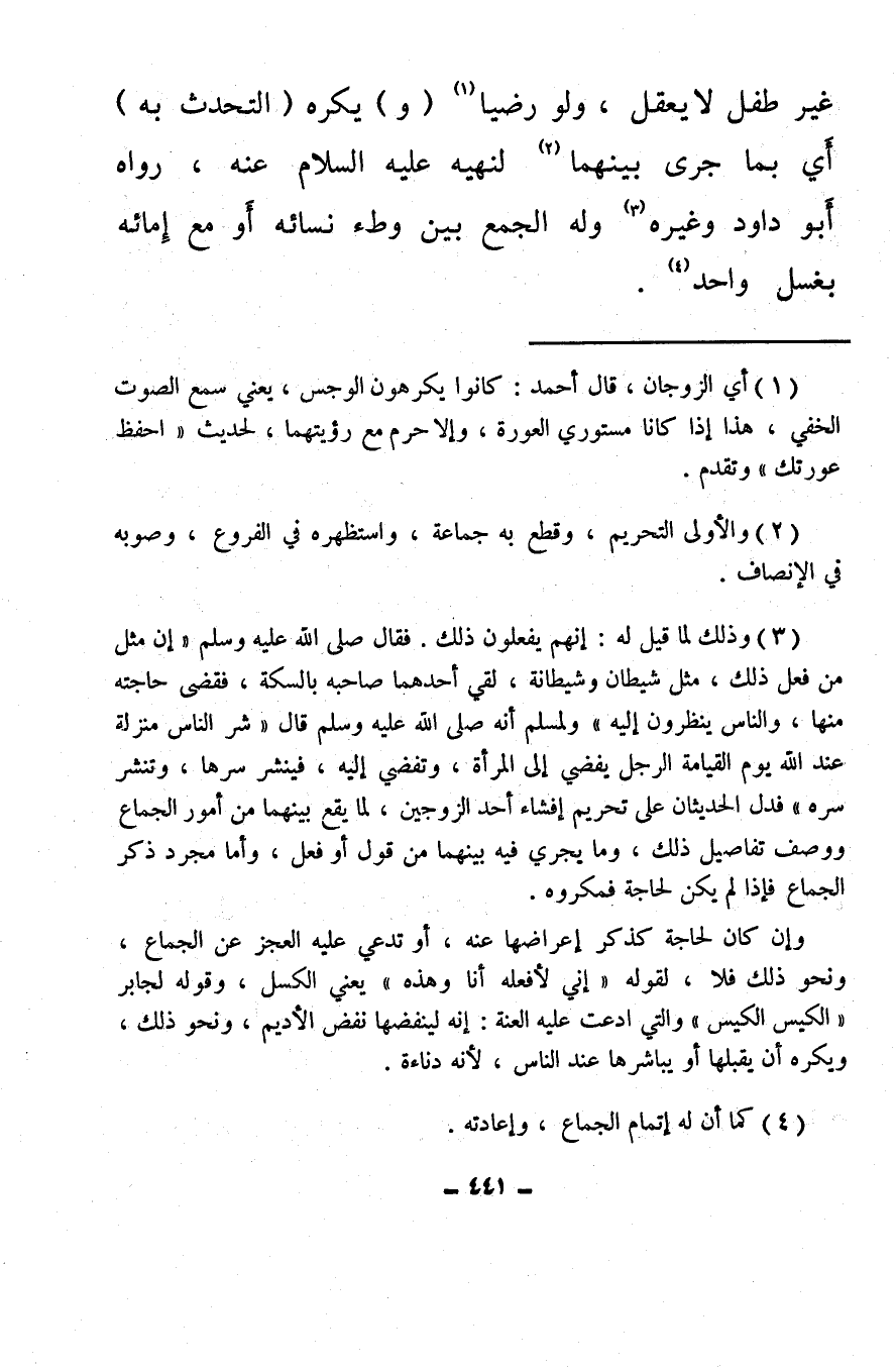(¬3) وذلك لما قيل له: إنهم يفعلون ذلك. فقال صلى الله عليه وسلم «إن مثل من فعل ذلك، مثل شيطان وشيطانة، لقي أحدهما صاحبه بالسكة، فقضى حاجته منها، والناس ينظرون إليه» ولمسلم أنه صلى الله عليه وسلم قال «شر الناس منزلة عند الله يوم القيامة الرجل يفضي إلى المرأة، وتفضي إليه، فينشر سرها، وتنشر سره» فدل الحديثان على تحريم إفشاء أحد الزوجين، لما يقع بينهما من أمور الجماع ووصف تفاصيل ذلك، وما يجري فيه بينهما من قول أو فعل، وأما مجرد ذكر الجماع فإذا لم يكن لحاجة فمكروه.