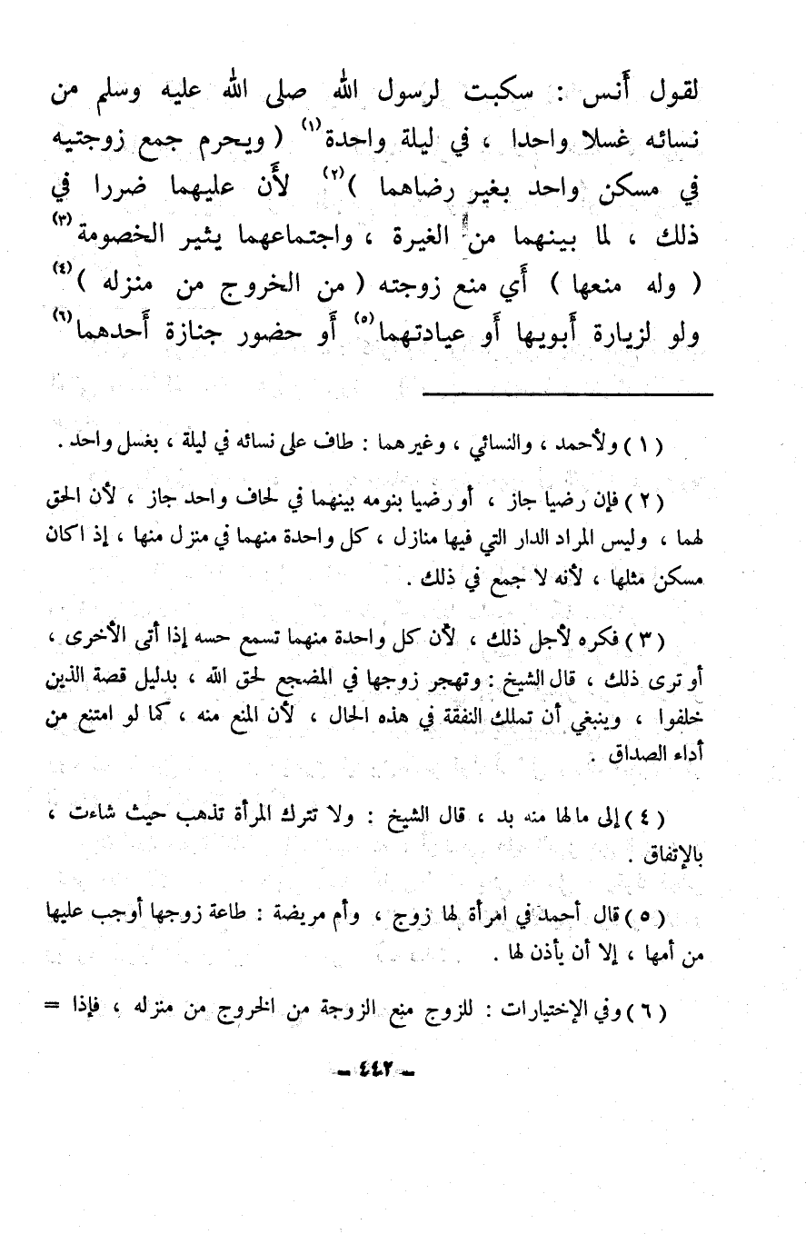 لقول أنس: سكبت لرسول الله صلى الله عليه وسلم من نسائه غسلا واحدا، في ليلة واحدة (¬1) (ويحرم جمع زوجتيه في مسكن واحد بغير رضاهما) (¬2) لأَن عليهما ضررا في ذلك، لما بينهما من الغيرة، واجتماعهما يثير الخصومة (¬3) (وله منعها) أي منع زوجته (من الخروج من منزله) (¬4) ولو لزيارة أبويها أو عيادتهما (¬5) أو حضور جنازة أحدهما (¬6)