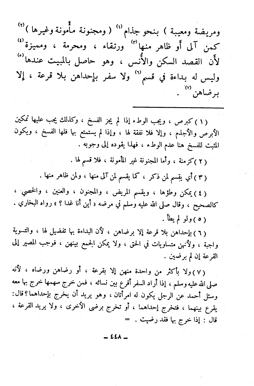 (¬7) ولا بأكثر من واحدة منهن إلا بقرعة، أو رضاهن ورضاه، لأنه صلى الله عليه وسلم، إذا أراد السفر أقرع بين نسائه، فمن خرج سهمها خرج بها معه وسئل أحمد عن الرجل يكون له امرأتان، وهو يريد أن يخرج بإحداهما، قال: يقرع بينهما، فتخرج إحداهما، أو تخرج برضى الأخرى، ولا يريد القرعة، قال: إذا خرج بها فقد رضيت. وإلا أقرع بينهما. وقال الأصحاب: يأثم إن سافر بإحداهن بغير قرعة ولا رضى، ويقضي، وفي الاختيارات: الأقوى أنه لا يقضي، وهو مذهب الحنفية، والمالكية.