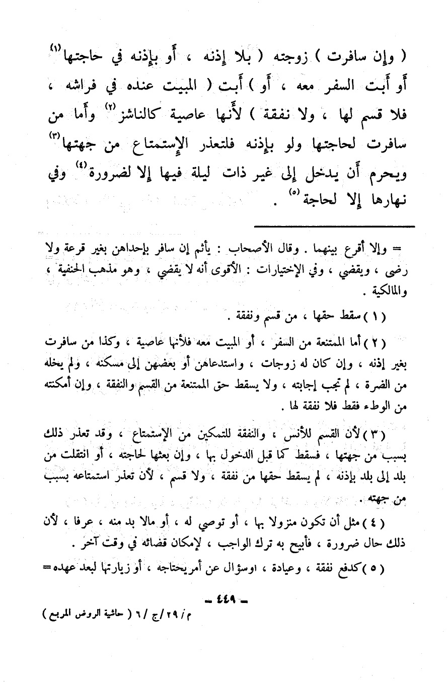 (¬2) أما الممتنعة من السفر، أو المبيت معه فلأنها عاصية، وكذا من سافرت بغير إذنه، وإن كان له زوجات، واستدعاهن أو بعضهن إلى مسكنه، ولم يخله من الضرة، لم تجب إجابته، ولا يسقط حق الممتنعة من القسم والنفقة، وإن أمكنته من الوطء فقط فلا نفقة لها.