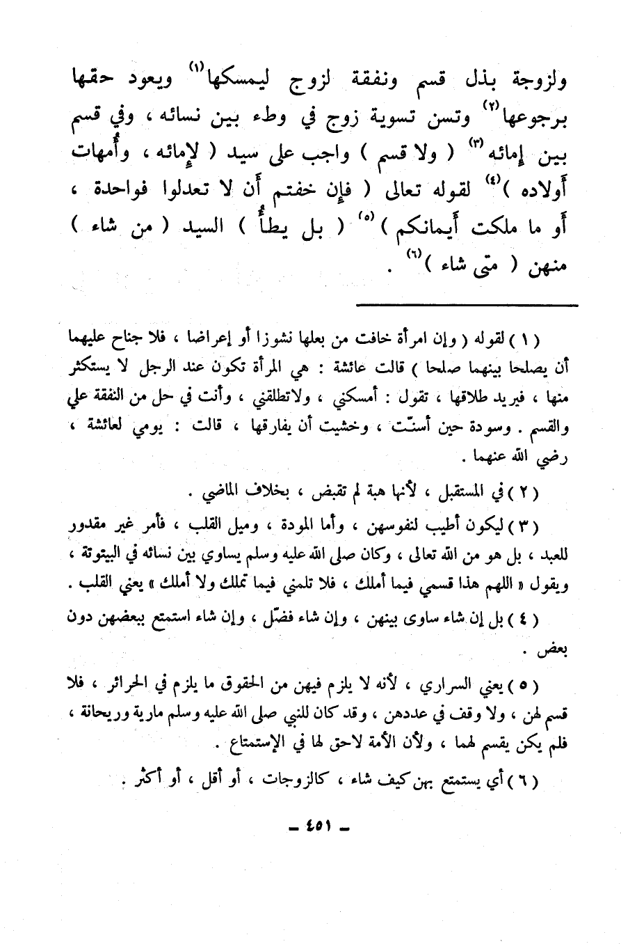 (¬3) ليكون أطيب لنفوسهن، وأما المودة، وميل القلب، فأمر غير مقدور للعبد، بل هو من الله تعالى، وكان صلى الله عليه وسلم يساوي بين نسائه في البيتوتة، ويقول «اللهم هذا قسمي فيما أملك، فلا تلمني فيما تملك ولا أملك» يعني القلب.