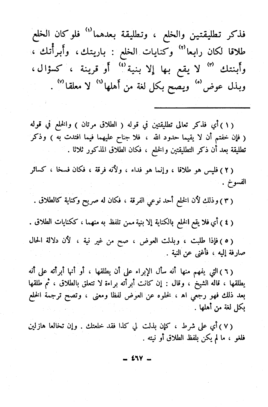 (¬6) التي يفهم منها أنه سأل الإبراء على أن يطلقها، أو أنها أبرأته على أنه يطلقها، قاله الشيخ، وقال: إن كانت أبرأته براءة لا تتعلق بالطلاق، ثم طلقها بعد ذلك فهو رجعي. اهـ. لخلوه عن العوض لفظا ومعنى، وتصح ترجمة الخلع بكل لغة من أهلها.