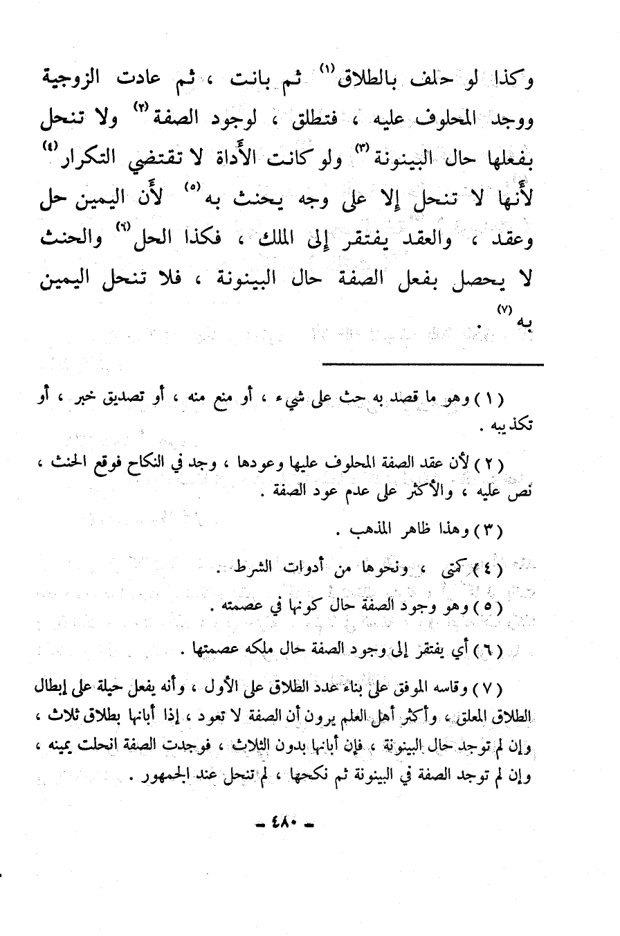 (¬7) وقاسه الموفق على بناء عدد الطلاق على الأول، وأنه يفعل حيلة على إبطال الطلاق المعلق، وأكثر أهل العلم يرون أن الصفة لا تعود، إذا أبانها بطلاق ثلاث، وإن لم توجد حال البينونة، فإن أبانها بدون الثلاث، فوجدت الصفة انحلت يمينه، وإن لم توجد الصفة في البينونة ثم نكحها، لم تنحل عند الجمهور.