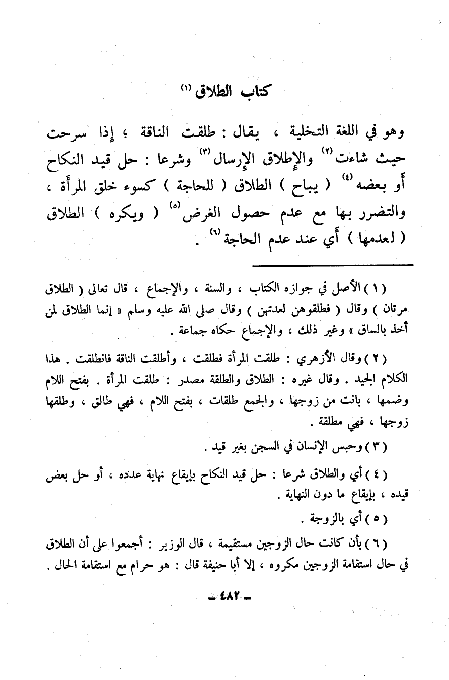 وهو في اللغة التخلية، يقال: طلقت الناقة؛ إذا سرحت حيث شاءت (¬2) والإطلاق الإرسال (¬3) وشرعا: حل قيد النكاح أو بعضه (¬4) (يباح) الطلاق (للحاجة) كسوء خلق المرأة، والتضرر بها مع عدم حصول الغرض (¬5) (ويكره) الطلاق (لعدمها) أي عند عدم الحاجة (¬6) .