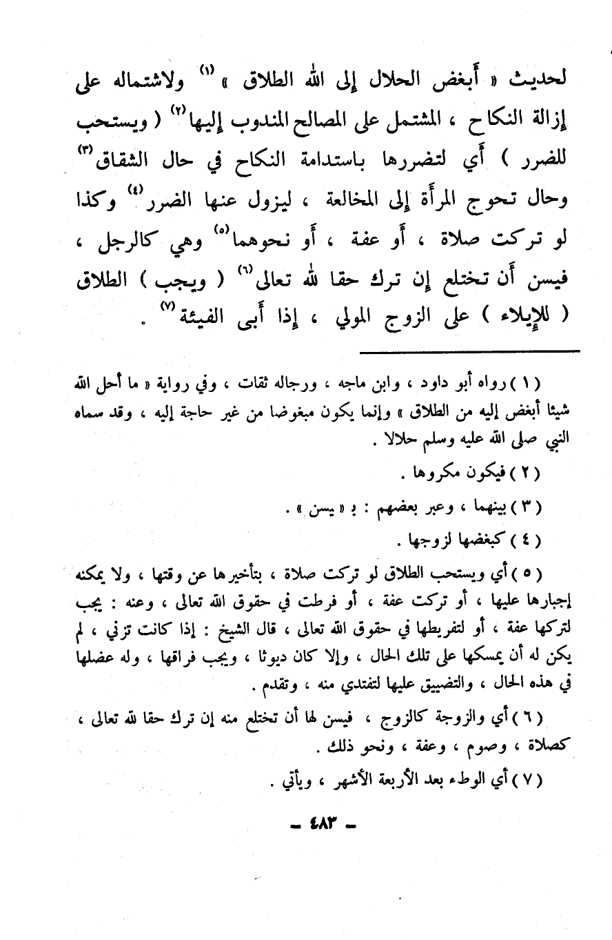 (¬1) رواه أبو داود، وابن ماجه، ورجاله ثقات، وفي رواية «ما أحل الله شيئًا أبغض إليه من الطلاق» وإنما يكون مبغوضا من غير حاجة إليه، وقد سماه النبي صلى الله عليه وسلم حلالا.