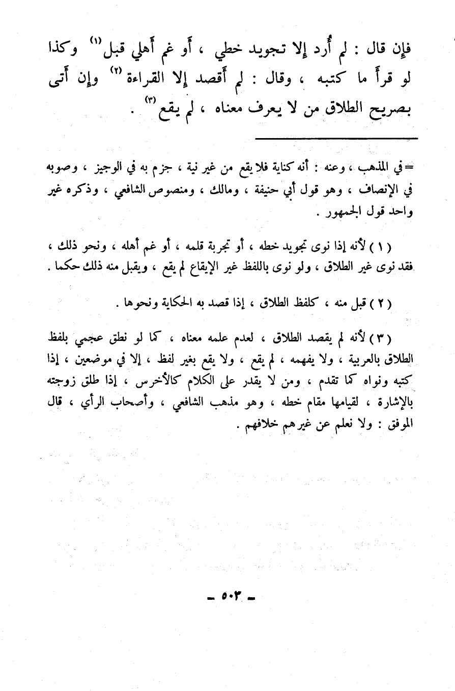(¬3) لأنه لم يقصد الطلاق، لعدم علمه معناه، كما لو نطق أعجمي بلفظ الطلاق بالعربية، ولا يفهمه، لم يقع، ولا يقع بغير لفظ، إلا في موضعين، إذا كتبه ونواه كما تقدم، ومن لا يقدر على الكلام كالأخرس، إذا طلق زوجته بالإشارة، لقيامها مقام خطه، وهو مذهب الشافعي، وأصحاب الرأي، قال الموفق: ولا نعلم عن غيرهم خلافهم.