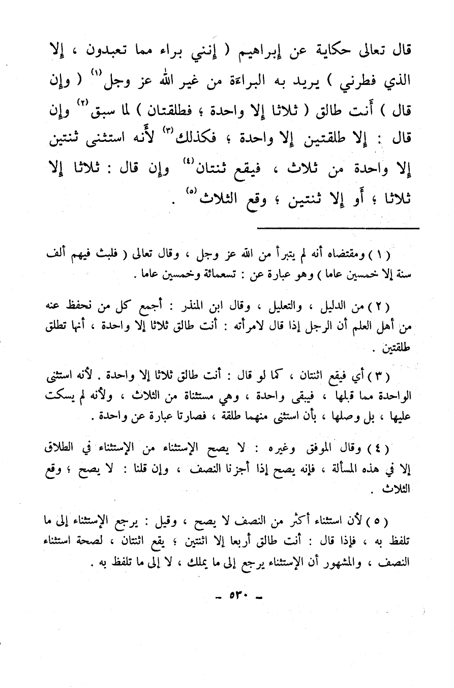 (¬5) لأن استثناء أكثر من النصف لا يصح، وقيل: يرجع الاستثناء إلى ما تلفظ به، فإذا قال: أنت طالق أربعا إلا اثنتين؛ يقع اثنتان، لصحة استثناء النصف، والمشهور أن الاستثناء يرجع إلى ما يملك، لا إلى ما تلفظ به.