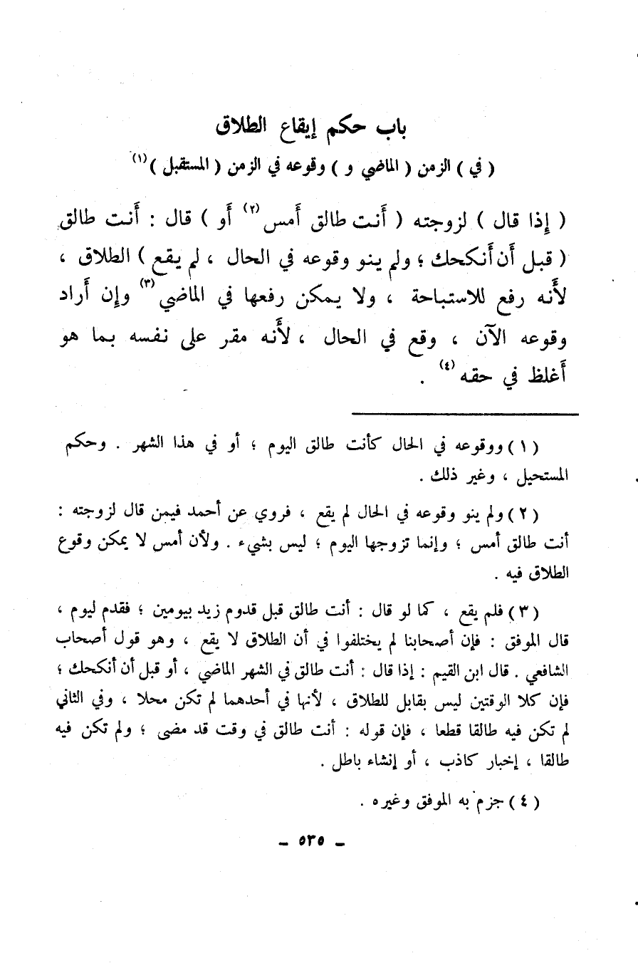 (¬3) فلم يقع، كما لو قال: أنت طالق قبل قدوم زيد بيومين، فقدم ليوم، قال الموفق: فإن أصحابنا لم يختلفوا في أن الطلاق لا يقع، وهو قول أصحاب الشافعي. قال ابن القيم: إذا قال: أنت طالق في الشهر الماضي، أو قبل أن أنكحك؛ فإن كلا الوقتين ليس بقابل للطلاق، لأنها في أحدهما لم تكن محلا، وفي الثاني لم تكن فيه طالقا قطعا، فإن قوله: أنت طالق في وقت قد مضى؛ ولم تكن فيه طالقا، إخبار كاذب، أو إنشاء باطل.