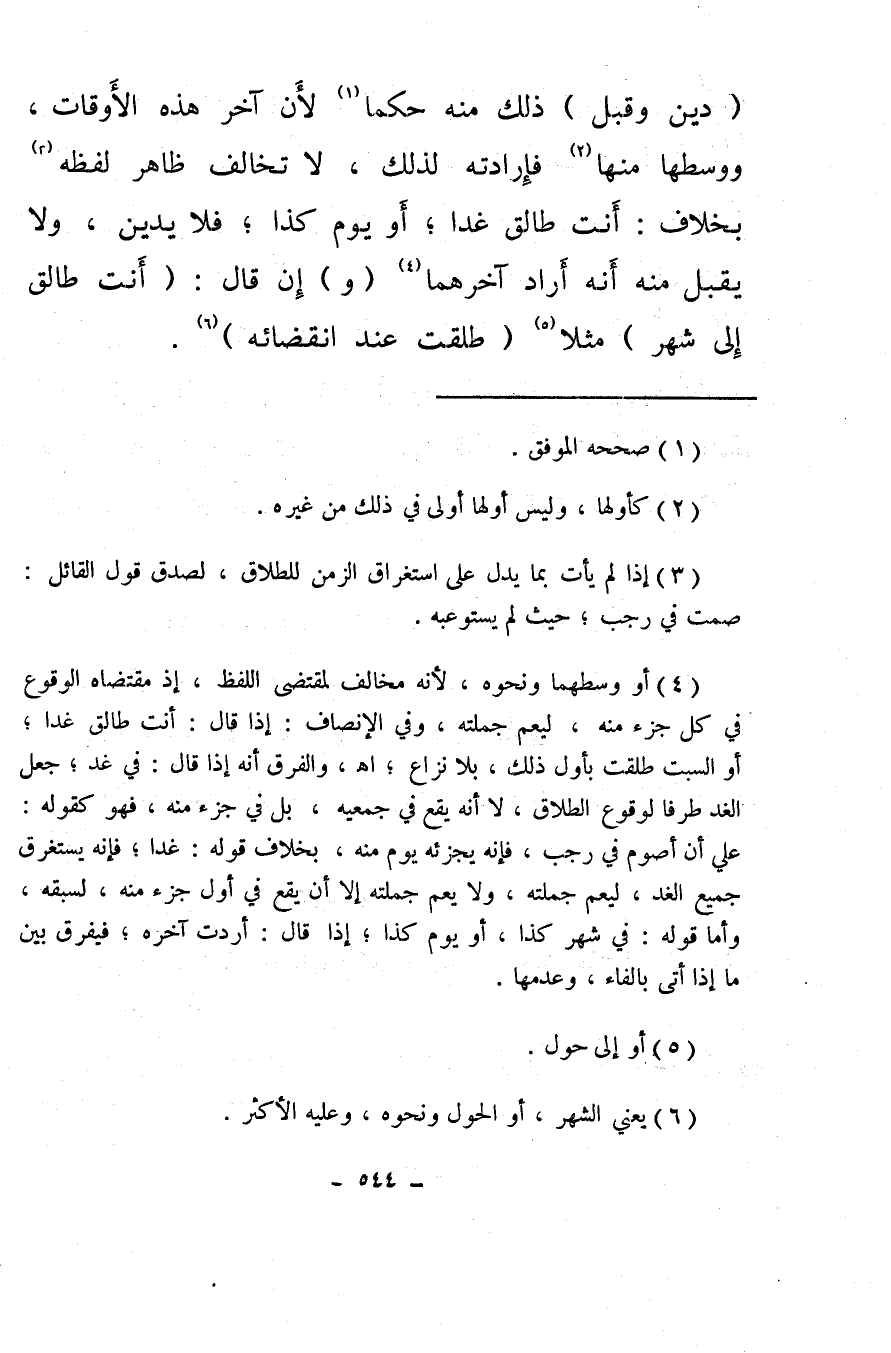 (¬4) أو وسطها ونحوه، لأنه مخالف مقتضى اللفظ، إذا مقتضاه الوقوع في كل جزء منه، ليعم جملته، وفي الإنصاف: إذ قال: أنت طالق غدا؛ أو السبت طلقت بأول ذلك، بلا نزاع. اهـ. والفرق أنه إذا قال: في غد؛ جعل الغد طرفا لوقوع الطلاق، لا أنه يقع في جميعه، بل في جزء منه، فهو كقوله: علي أن أصوم في رجب، فإنه يجزئه يوم منه، بخلاف قوله: غدا؛ فإنه يستغرق جميع الغد، ليعم جملته، ولا يعم جملته إلا أن يقع في أول جزء منه، لسبقه، وأما قوله: في شهر كذا، أو يوم كذا؛ إذا قال: أردت آخره؛ فيفرق بين ما إذا أتى بالفاء، وعدمها.
