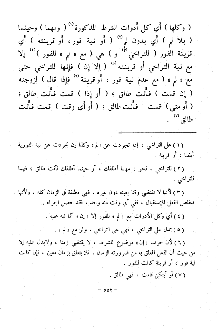 (¬6) لأن حرف "إن" موضوع للشرط، لا يقتضي زمنا، ولا يدل عليه إلا من حيث إن الفعل المعلق به من ضرورته الزمان، فلا يتعلق بزمان معين، فإن كانت نية فور، أو قرينة كانت للفور.