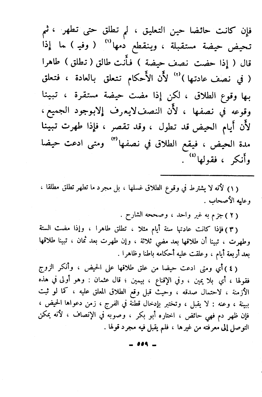 (¬3) فإذا كانت عادتها ستة أيام مثلا، تطلق طاهرا، وإذا مضت الستة وطهرت، تبينا أن طلاقها بعد مضي ثلاثة، وإن طهرت بعد ثمان، تبينا طلاقها بعد أربعة أيام، وعلقت عليه أحكامه باطنا وظاهرًا.
