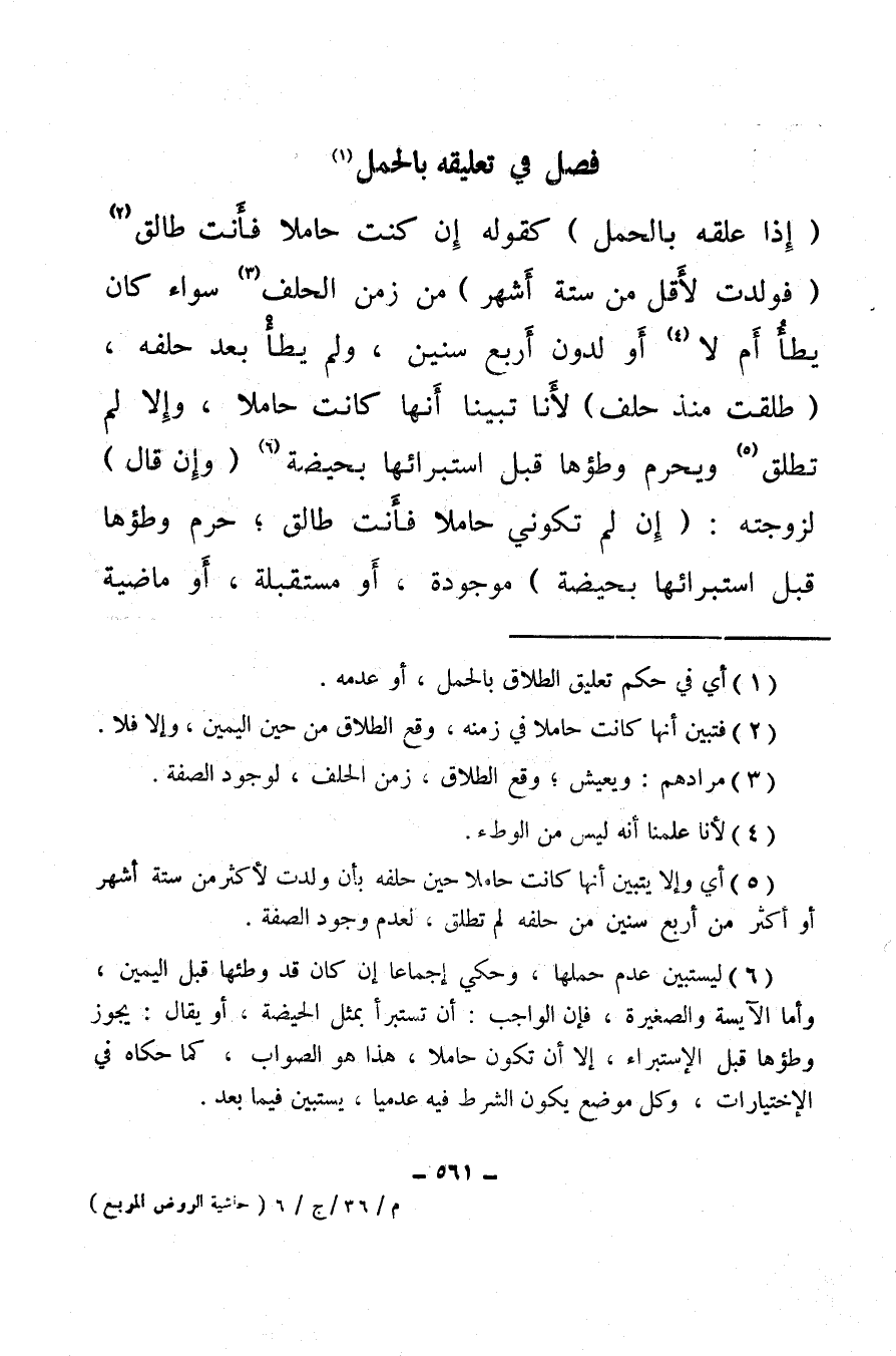 (إذا علق بالحمل) كقوله إن كنت حاملا فأنت طالق (¬2) (فولدت لأقل من ستة أشهر) من زمن الحلف (¬3) سواء كان يطأ أم لا (¬4) أو لدون أربع سنين، ولم يطأ بعد حلفه، (طلقت منذ حلف) لأنا تبينا أنها كانت حاملا، وإلا لم تطلق (¬5) ويحرم وطؤها قبل استبرائها بحيضة (¬6) (وإن قال) لزوجته: (إن لم تكوني حاملا فأنت طالق؛ حرم وطؤها قبل استبرائها بحيضة) موجودة، أو مستقبلة، أو ماضية