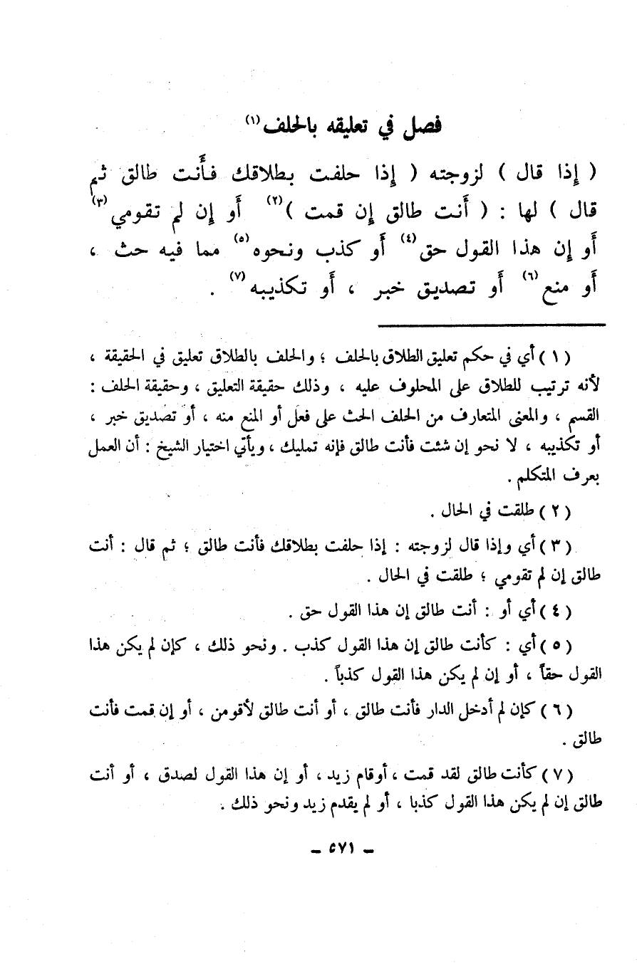 (¬1) أي في حكم تعليق الطلاق بالحلف؛ والحلف بالطلاق تعليق في الحقيقة، لأنه ترتيب للطلاق على المحلوف عليه، وذلك حقيقة التعليق، وحقيقة الحلف: القسم، والمعنى المتعارف من الحلف الحث على فعل أو المنع منه، أو تصديق خبر، أو تكذيبه، لا نحو إن شئت فأنت طالق فإنه تمليك، ويأتي اختيار الشيخ: أن العمل بعرف المتكلم.