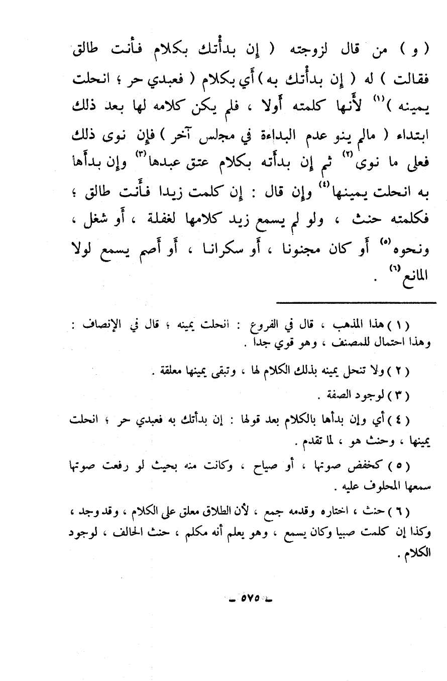 (و) من قال لزوجته (إن بدأْتك بكلام فأنت طالق فقالت) له (إن بدأتك به) أي بكلام (فعبدي حر؛ انحلت يمينه) (¬1) لأنها كلمته أولاً، فلم يكن كلامه لها بعد ذلك ابتداء (ما لم ينو عدم البداءة في مجلس آخر) فإن نوى ذلك فعلى ما نوى (¬2) ثم إن بدأته بكلام عتق عبدها (¬3) وإن بدأها به انحلت يمينها (¬4) وإن قال: إن كلمت زيدا فأنت طالق؛ فكلمته حنث، ولو لم يسمع زيد كلامها لغفلة، أو شغل، ونحوه (¬5) أو كان مجنونا، أو سكرانا، أو أصم يسمع لولا المانع (¬6) .