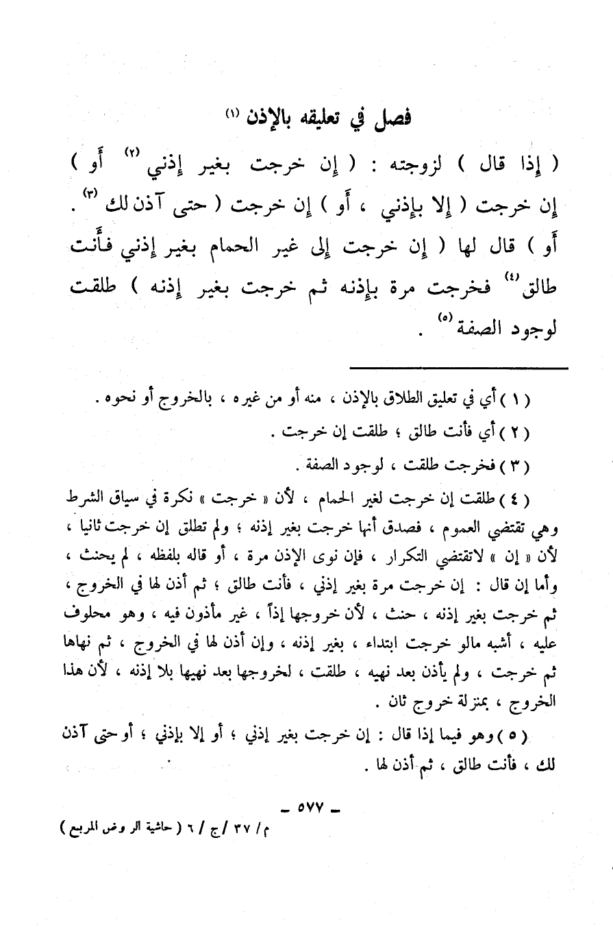 (¬5) وهو فيما إذا قال: إن خرجت بغير إذني، أو إلا بإذني، أو حتى آذن لك، فأنت طالق، ثم أذن لها.