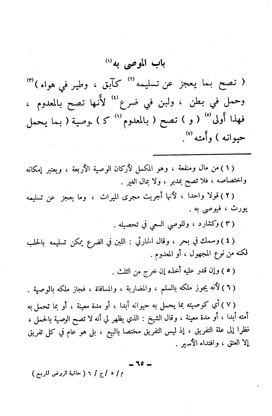 (¬7) أي كوصيته بما يحمل به حيوانه أبدا، أو مدة معينة، أو بما تحمل به أمته أبدا، أو مدة معينة، وقال الشيخ: الذي يظهر لي أنه لا تصح الوصية بالحمل، نظرا إلى علة التفريق، إذ ليس التفريق مختصا بالبيع، بل هو عام في كل تفريق إلا العتق، وافتداء الأسير.