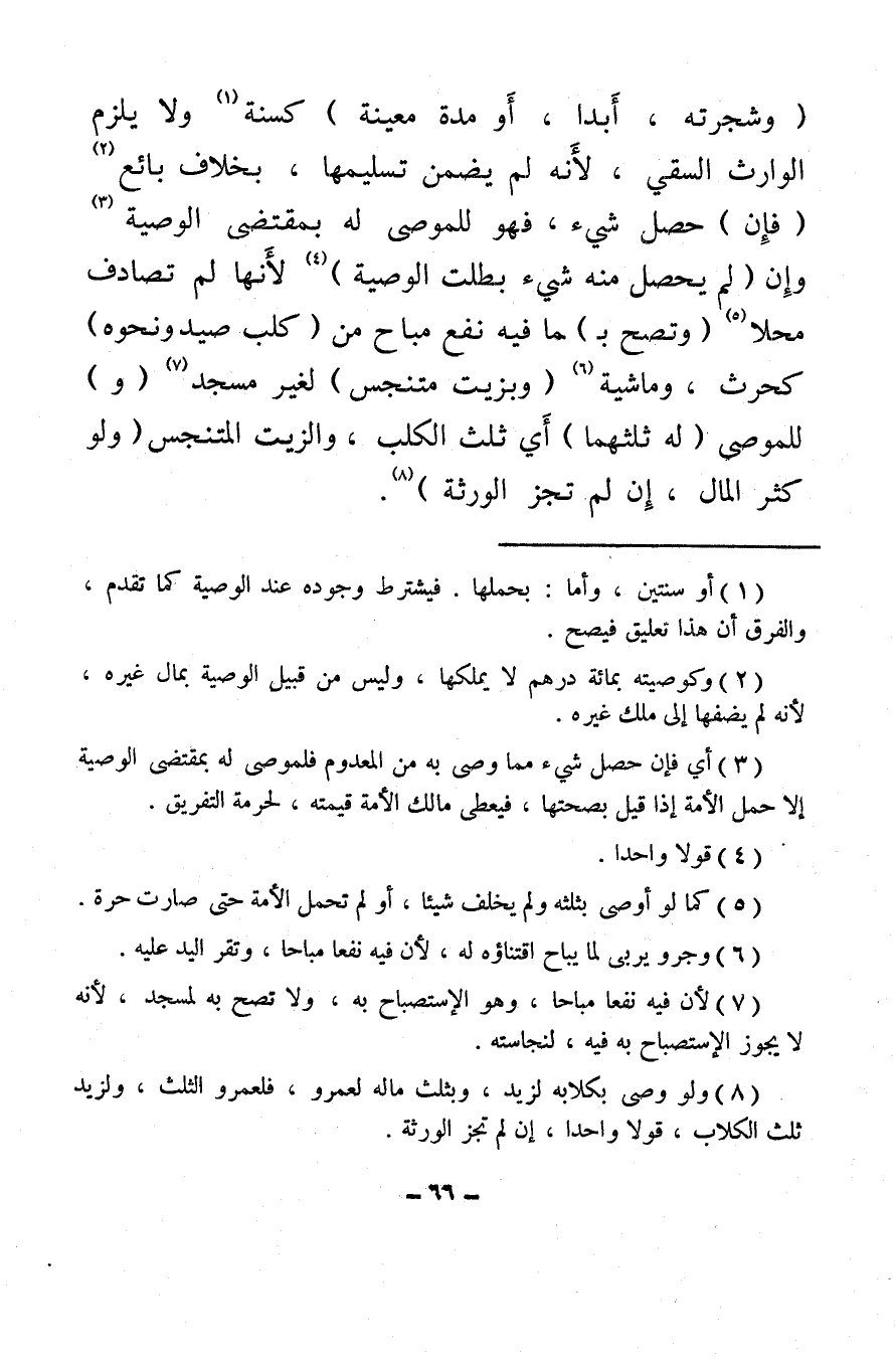 (وشجرته، أَبدا، أَو مدة معينة) كسنة (¬1) ولا يلزم الوارث السقي، لأَنه لم يضمن تسليمها، بخلاف بائع (¬2) (فإِن) حصل شيء، فهو للموصي له بمقتضى الوصية (¬3) وإِن (لم يحصل منه شيء بطلت الوصية) (¬4) لأَنها لم تصادف محلا (¬5) (وتصح بـ) ـما فيه نفع مباح من (كلب صيد ونحوه) كحرث، وماشية (¬6) (وبزيت متنجس) لغير مسجد (¬7) (و) للموصي (له ثلثهما) أي ثلث الكلب، والزيت المتنجس (ولو كثر المال، إن لم تجز الورثة) (¬8) .