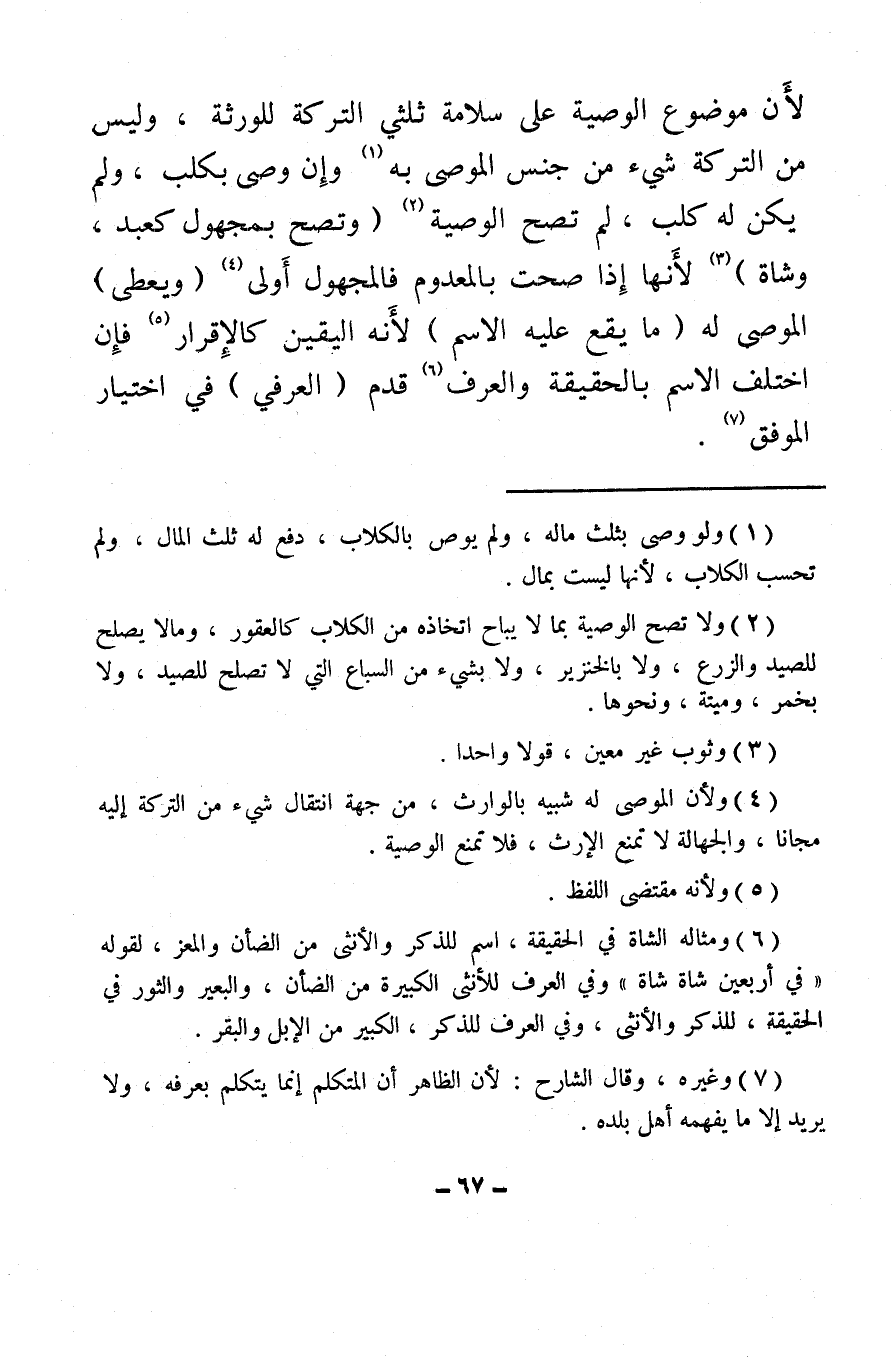 (¬2) ولا تصح الوصية بما لا يباح اتخاذه من الكلاب كالعقور، وما لا يصلح للصيد والزرع، ولا بالخنزير، ولا بشيء من السباع التي لا تصلح للصيد، ولا بخمر، وميتة، ونحوها.