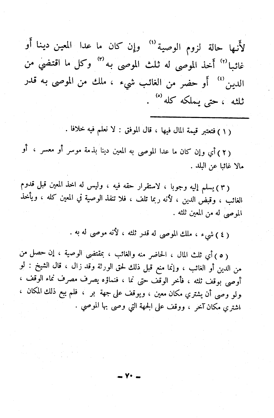 (¬5) أي ثلث المال، الحاضر منه والغائب، بمقتضى الوصية، إن حصل من الدين أو الغائب، وإنما منع قبل ذلك لحق الورثة وقد زال، قال الشيخ: لو أوصي بوقف ثلثه، فأخر الوقف حتى نما، فنماؤه يصرف مصرف نماء الوقف، ولو وصي أن يشتري مكان معين، ويوقف على جهة بر، فلم يبع ذلك المكان، اشتري مكان آخر، ووقف على الجهة التي وصي بها الموصي.