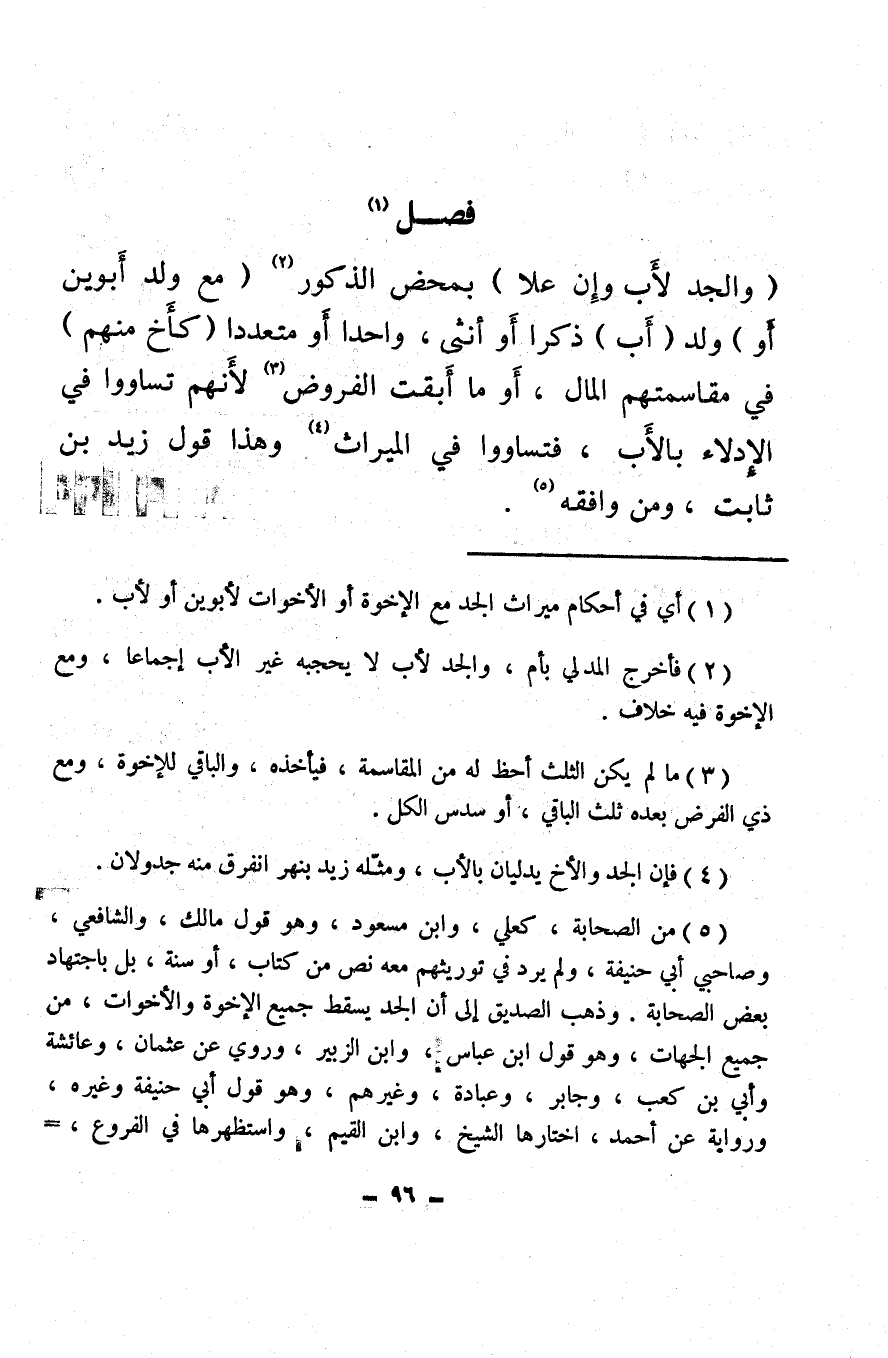 (¬5) من الصحابة، كعلي، وابن مسعود، وهو قول مالك، والشافعي، وصاحبى أبي حنيفة، ولم يرد في توريثهم معه نص من كتاب، أو سنة، بل باجتهاد بعض الصحابة. وذهب الصديق إلى أن الجد يسقط جميع الإخوة والأخوات، من جميع الجهات، وهو قول ابن عباسن وابن الزبير، وروي عن عثمان، وعائشة وأبي بن كعب، وجابر، وعبادة، وغيرهم، وهو قول أبي حنيفة وغيره،