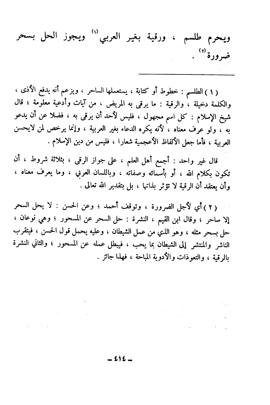 (¬2) أي لأجل الضرورة، وتوقف أحمد، وعن الحسن: لا يحل السحر إلا ساحر، وقال ابن القيم، النشرة، حل السحر عن المسحور، وهي نوعان، حل بسحر مثله، وهو الذي من عمل الشيطان، وعليه يحمل قول الحسن، فيتقرب الناشر والمنتشر إلى الشيطان بما يجب، فيبطل عمله عن المسحور، والثاني النشرة بالرقية، والتعوذات والأدوية المباحة، فهذا جائز