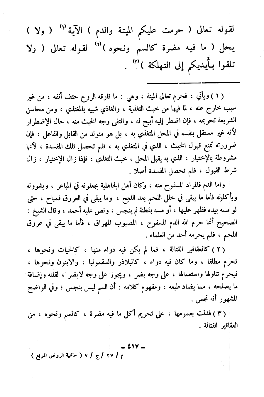 لقوله تعالى: {حُرِّمَتْ عَلَيْكُمُ الْمَيْتَةُ وَالدَّمُ} الآية (¬1) (ولا) يحل (ما فيه مضرة كالسم ونحوه) (¬2) لقوله تعالى: {وَلا تُلْقُوا بِأَيْدِيكُمْ إِلَى التَّهْلُكَةِ} (¬3) .