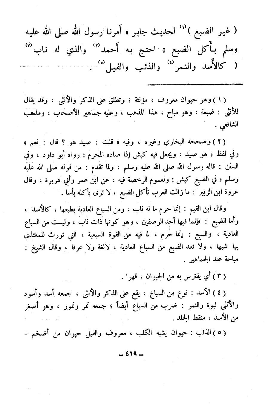 (¬1) وهو حيوان معروف، مؤنثة وتطلق على الذكر والأنثى، وقد يقال للأنثى ضبعة وهو مباح، هذا المذهب، وعليه جماهير الأصحاب، ومذهب الشافعي.