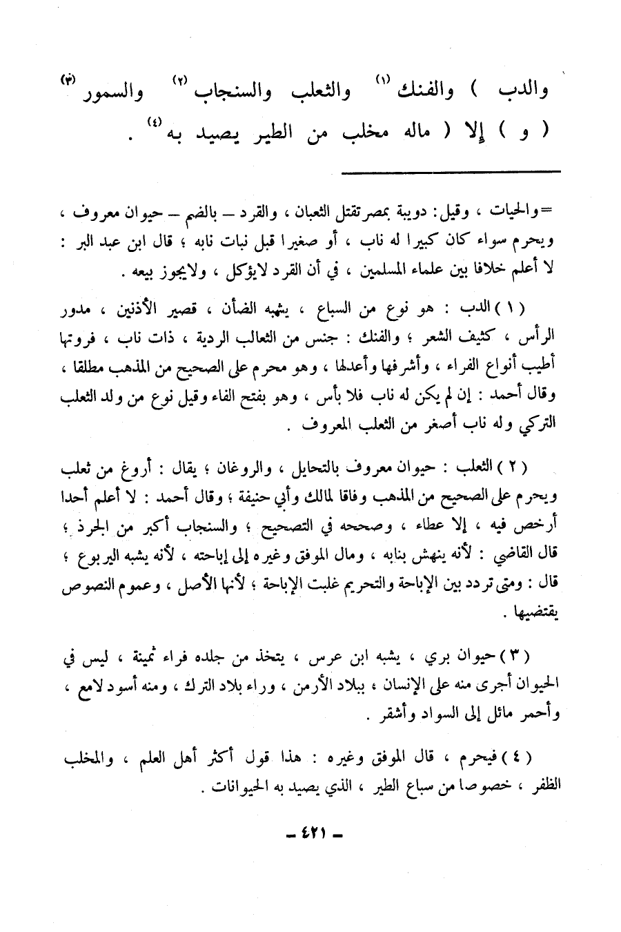 (¬1) الدب: هو نوع من السباع، يشبه الضأن، قصير الأذنين، مدور الرأس، كثيف الشعر، والفنك: جنس من الثعالب الردية، ذات ناب، فروتها أطيب أنواع الفراء، وأشرفها وأعدلها، وهو محرم على الصحيح من المذهب مطلقا، وقال أحمد: إن لم يكن له ناب فلا بأس، وهو بفتح الفاء وقيل نوع من ولد الثعلب التركي وله ناب أصغر من الثعلب المعروف.