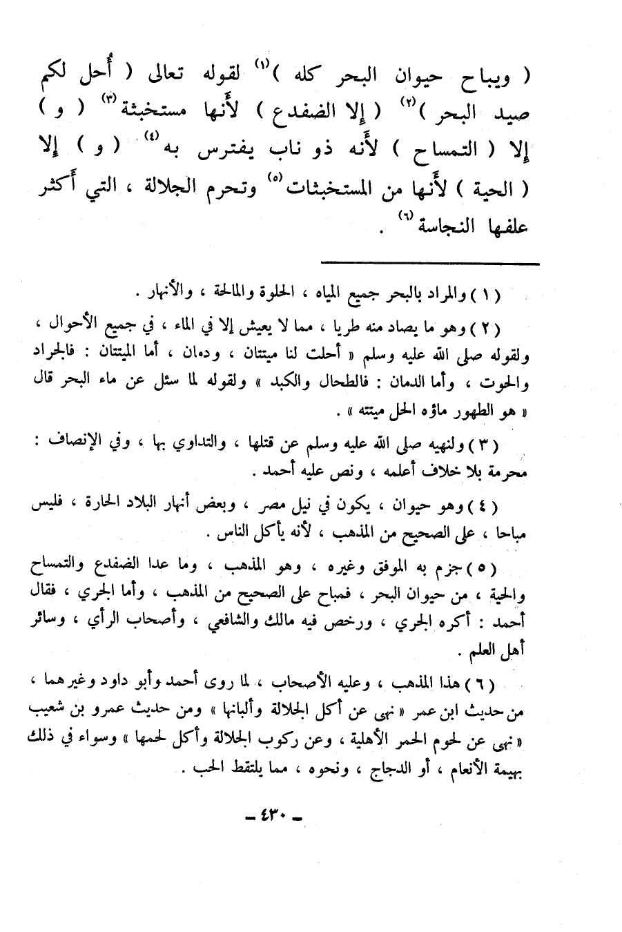 (¬5) جزم به الموفق وغيره، وهو المذهب، وما عدا الضفدع، والتمساح والحية، من حيوان البحر، فمباح على الصحيح من المذهب، وأما الجري، فقال أحمد: أكره الجري، ورخص فيه مالك والشافعي، وأصحاب الرأي، وسائر أهل العلم.