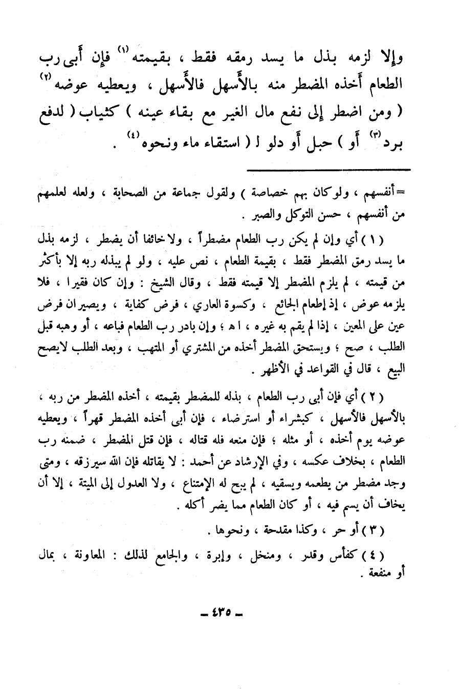 (¬1) أي وإن لم يكن رب الطعام مضطرا، ولا خائفا أن يضطر، لزمه بذل ما يسد رمق المضطر فقط، بقيمة الطعام، نص عليه ولو لم يبذله ربه إلا باكثر من قيمته، لم يلزم المضطر إلا قيمته فقط، وقال الشيخ: وإن كان فقيرا، فلا يلزمه عوض، إذ إطعام الجائع، وكسوة العاري، فرض كفاية، ويصيران فرض عين على المعينن إذا لم يقم به غيره اهـ، وإن بادر رب الطعام فباعه، أو وهبه قبل الطلب صح، ويستحق المضطر أخذه من المشتري أو المتهب، وبعد الطلب لا يصح البيع قال في القواعد في الأظهر.