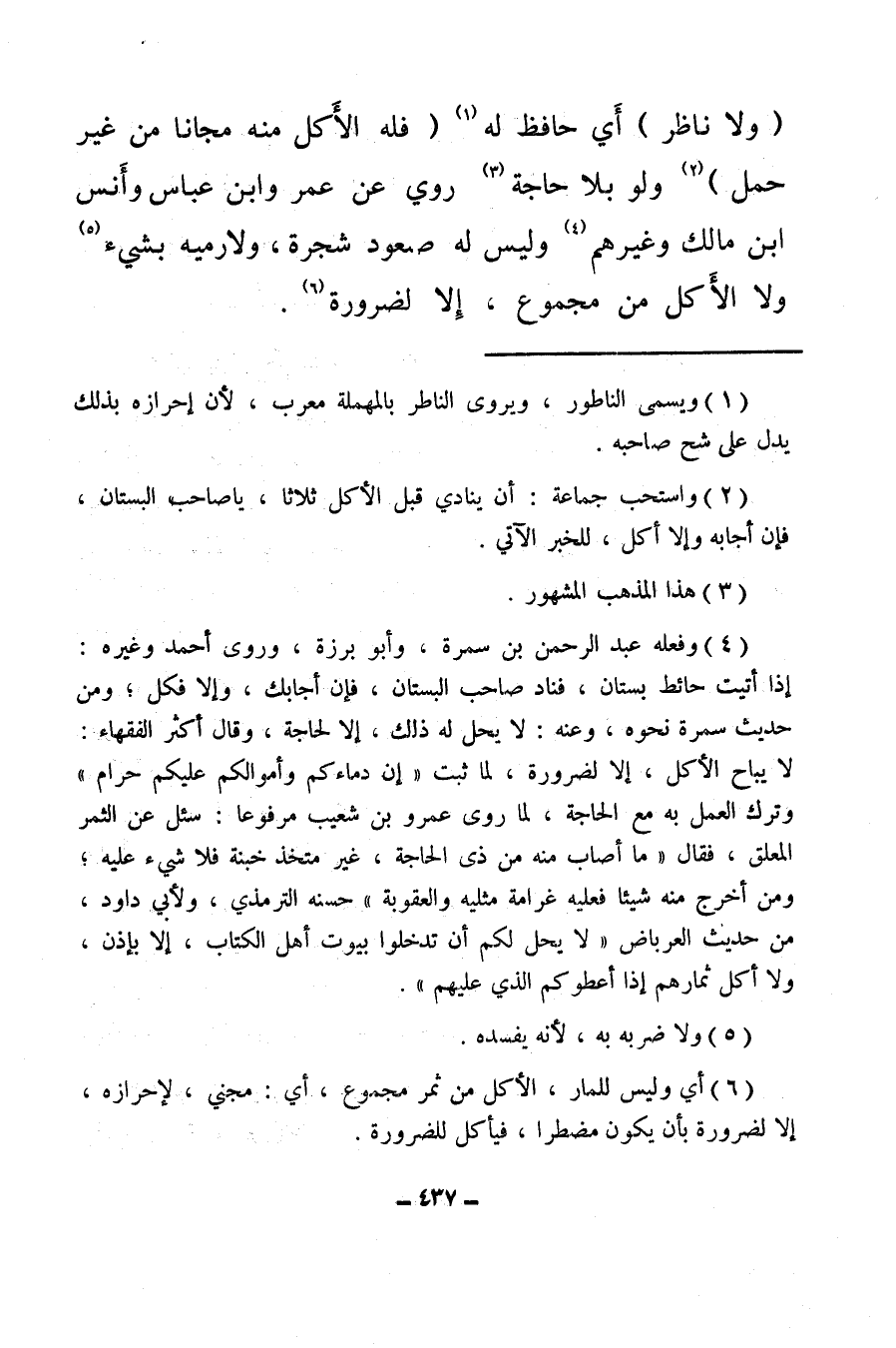 (¬4) وفعله عبد الرحمن بن سمرة، وأبو برزة، وروى أحمد وغيره إذا أتيت حائط بستان، فناد صاحب البستان، فإن أجابك، وإلا فكل، ومن حديث سمرة نحوه، وعنه: لا يحل له ذلك، إلا لحاجة وقال أكثر الفقهاء: لا يباح الأكل إلا لضرورة لما ثبت «إن دماءكم وأموالكم عليكم حرام» ، وترك العمل به مع الحاجة، لما روى عمرو بن شعيب مروفعا، سئل عن الثمر المعلق، فقال: «ما أصاب منه من ذي الحاجة غير متخذ خبنة فلا شيء عليه، ومن أخرج منه شيئا فعليه غرامة مثليه والعقوبة» حسنه الترمذي: ولأبي داود، من حديث العرباض «لا يحل لكم أن تدخلوا بيوت أهل الكتاب إلا بإذن ولا أكل ثمارهم إذا أعطوكم الذي عليهم» .