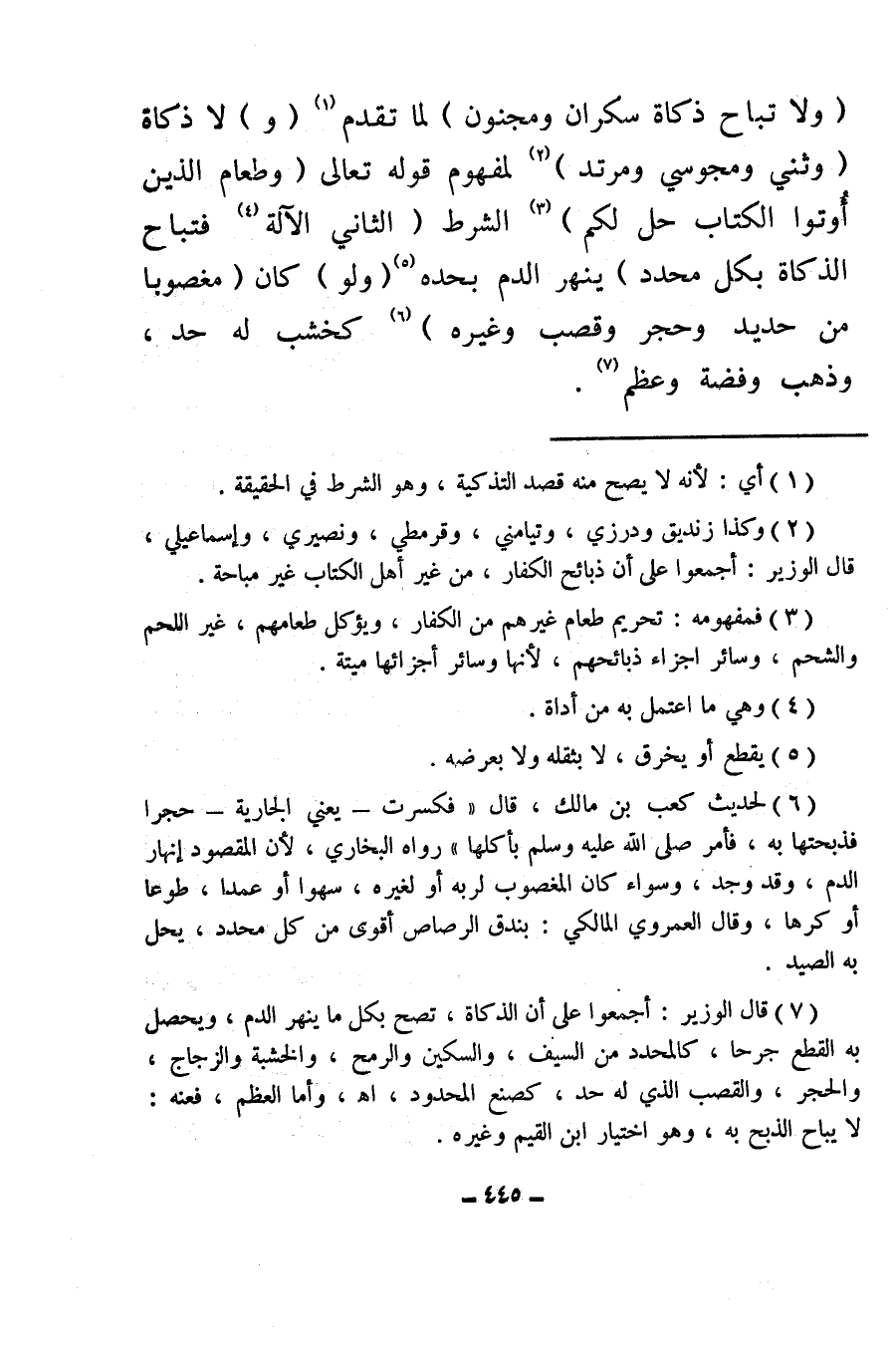 (¬7) قال الوزير: أجمعوا على أن الذكاة تصح بكل ما ينهر الدم، ويحصل به القطع جرحا، كالمحدد من السيف، والسكين والرمح، والخشية والزجاج، والحجر، والقصب الذي له حد، كصنع المحدود اهـ وأما العظم فعنه: لا يباح الذبح به، وهو اختيار ابن القيم وغيره.