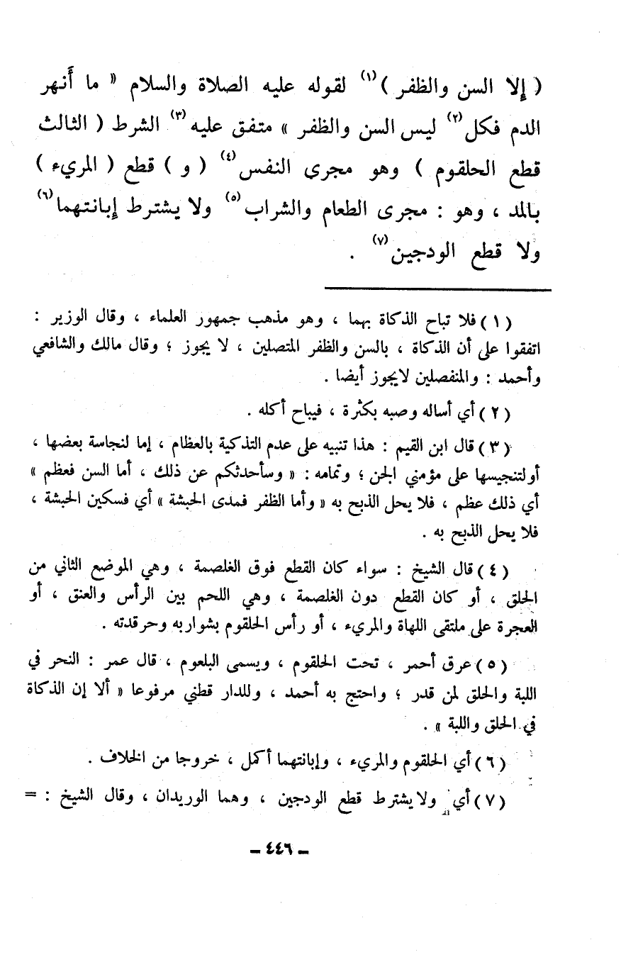 (¬4) قال الشيخ: سواء كان القطع فوق الغلصمة، وهي الموضع الثاني من الحلق أو كان القطع دون الغلصمة، وهي اللحم بين الرأس والعنق، أو العجرة على ملتقى اللهاة والمريء، أو رأس الحلقوم بشواربه وحرقدته.